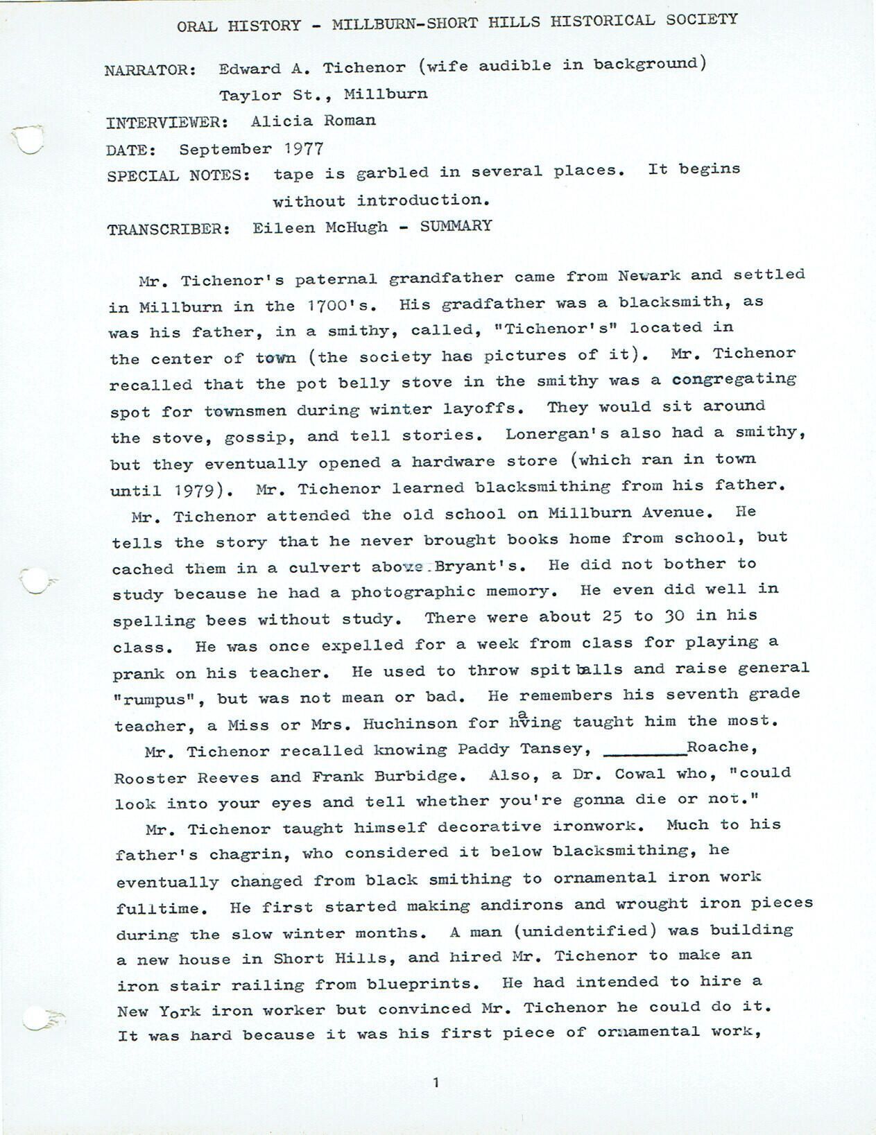 Tichenor's were some of the first settlers in Millburn in the 18th century. Edward's grandfather and father were blacksmiths, and Edward learned the trade from his father. He taught himself decorative ironwork. Tichenor retired at 55 years old with 6 million dollars and bought a farm in Matawan. Businesses he recalled in Millburn were: Mc Cullen Brothers General Store (Corner of Main & Millburn), Mrs. Schultz's Candy Store, Mundy's food store (corner of Main and Millburn), Milburn Hotel (owned by Pollack), In the Bank building at one time was Campbell's Drugs. Campbell's homestead was at the Chanticler and Bonnel's meat store.Collection