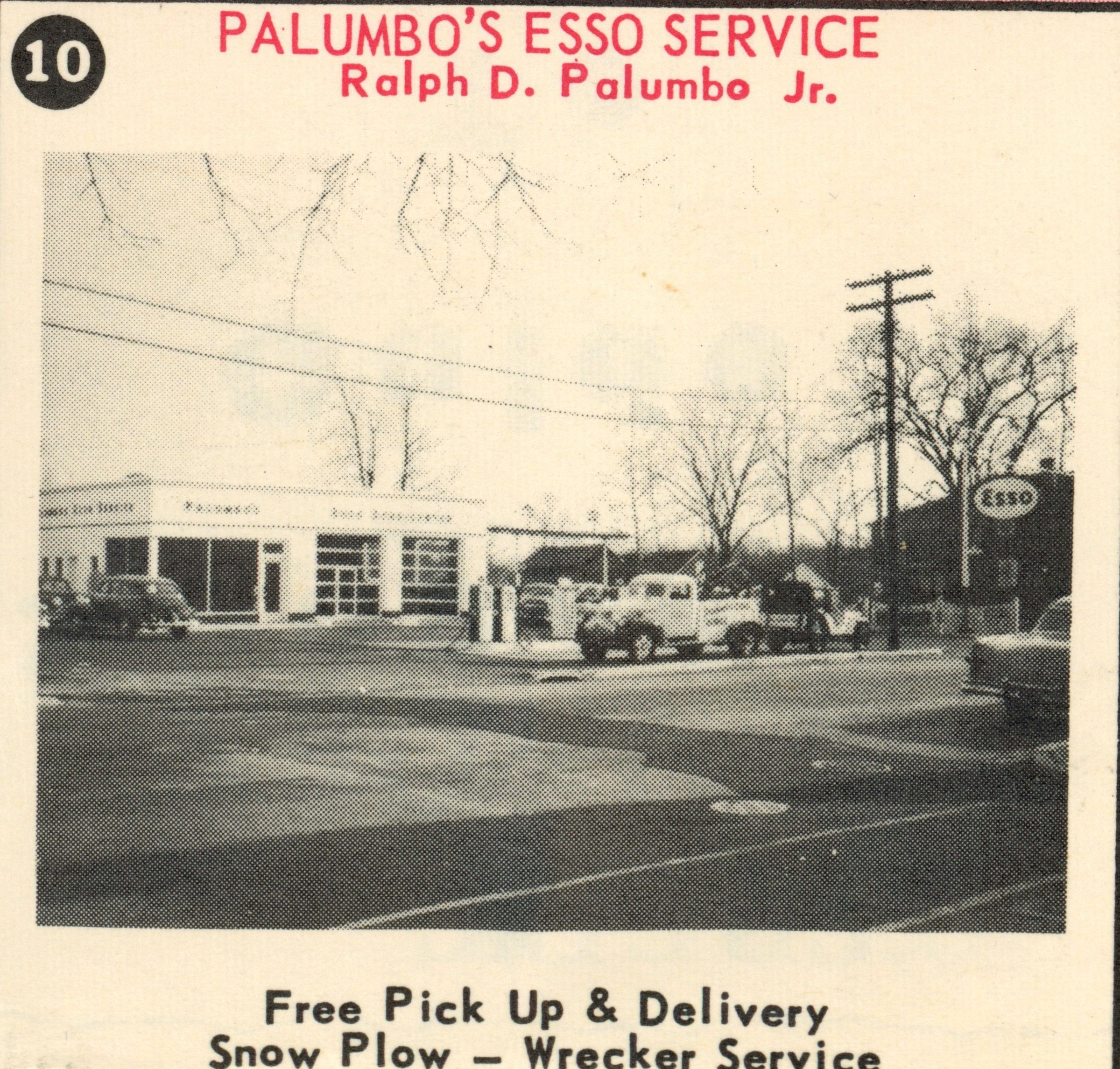 Photograph of Palumbo's Esso Service Station, 238 Main Street, Millburn published in the 1955 Shopper's Guide to Millburn, New Jersey, published by Photolith Advertising Company, Cranford, N.J. Ralph D. Palumbo, Jr. Featuring free pick up and deliver, snow plow and wrecker service.Acquisition