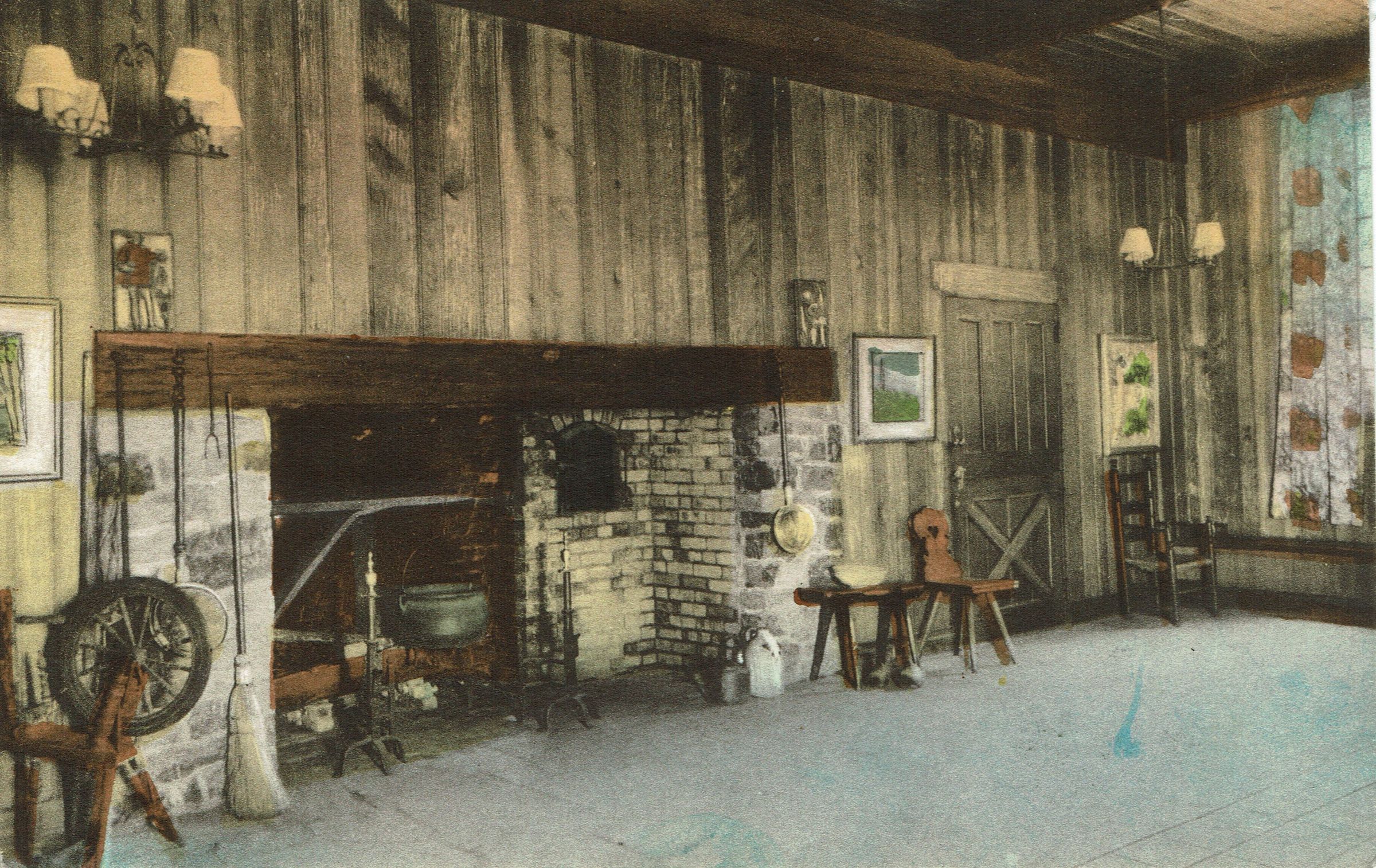 Hand colored image of the fireplace in the lobby at the Paper Mill Playhouse. Caption on verso of card reads: "This century old paper mill was remodeled in 1934 into a modern theatre and is now well-known for its fine productions of both plays and operettas."