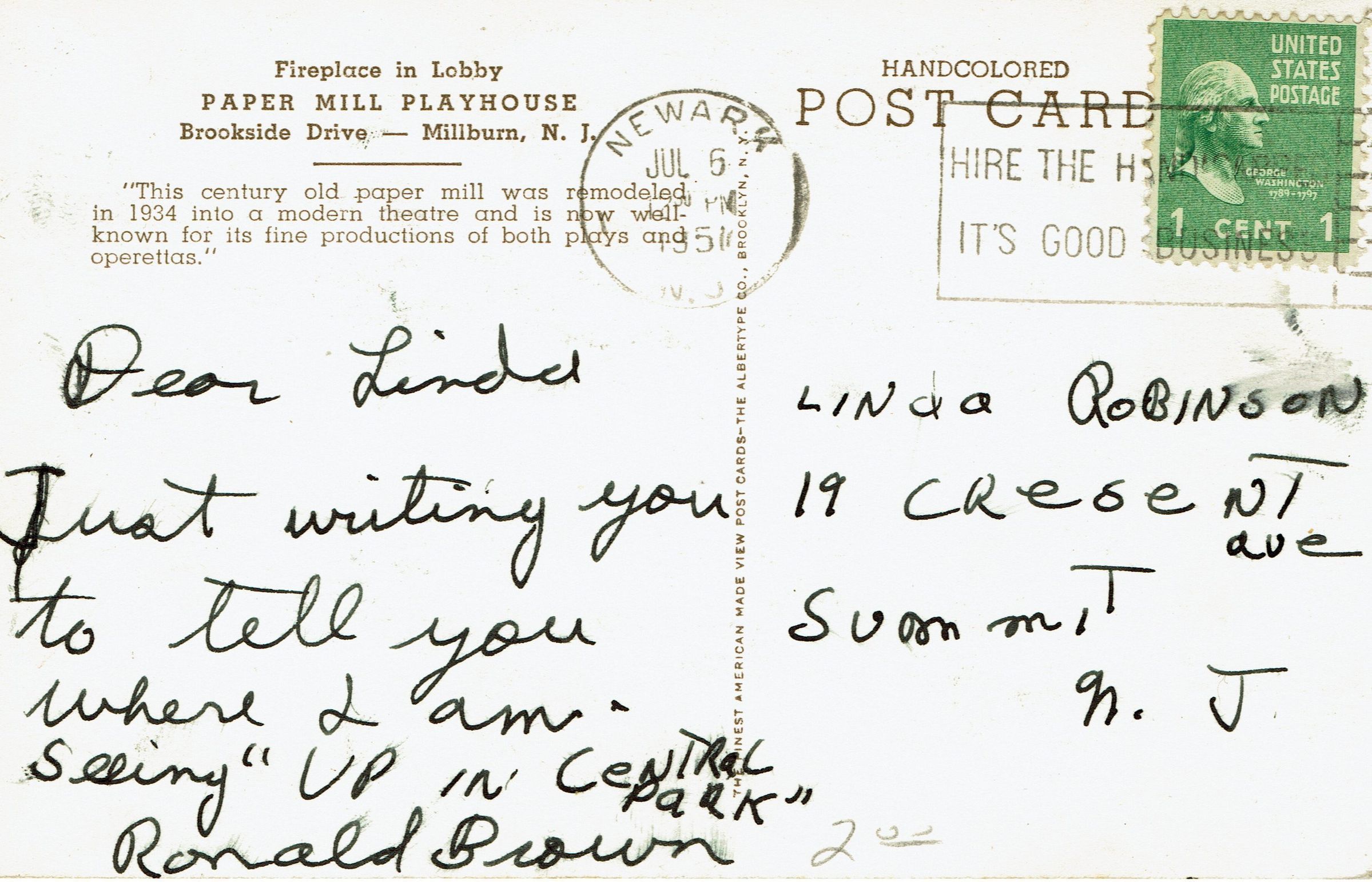 Postally used, postmarked Newark, July 6, 1951. Card is addressed to Linda Robinson, 19 Cresent Ave, Summit, N.J. Message reads, "Dear Linda, Just writing you to tell you where I am seeing "Up in Central Park." Ronald Brown.Collection