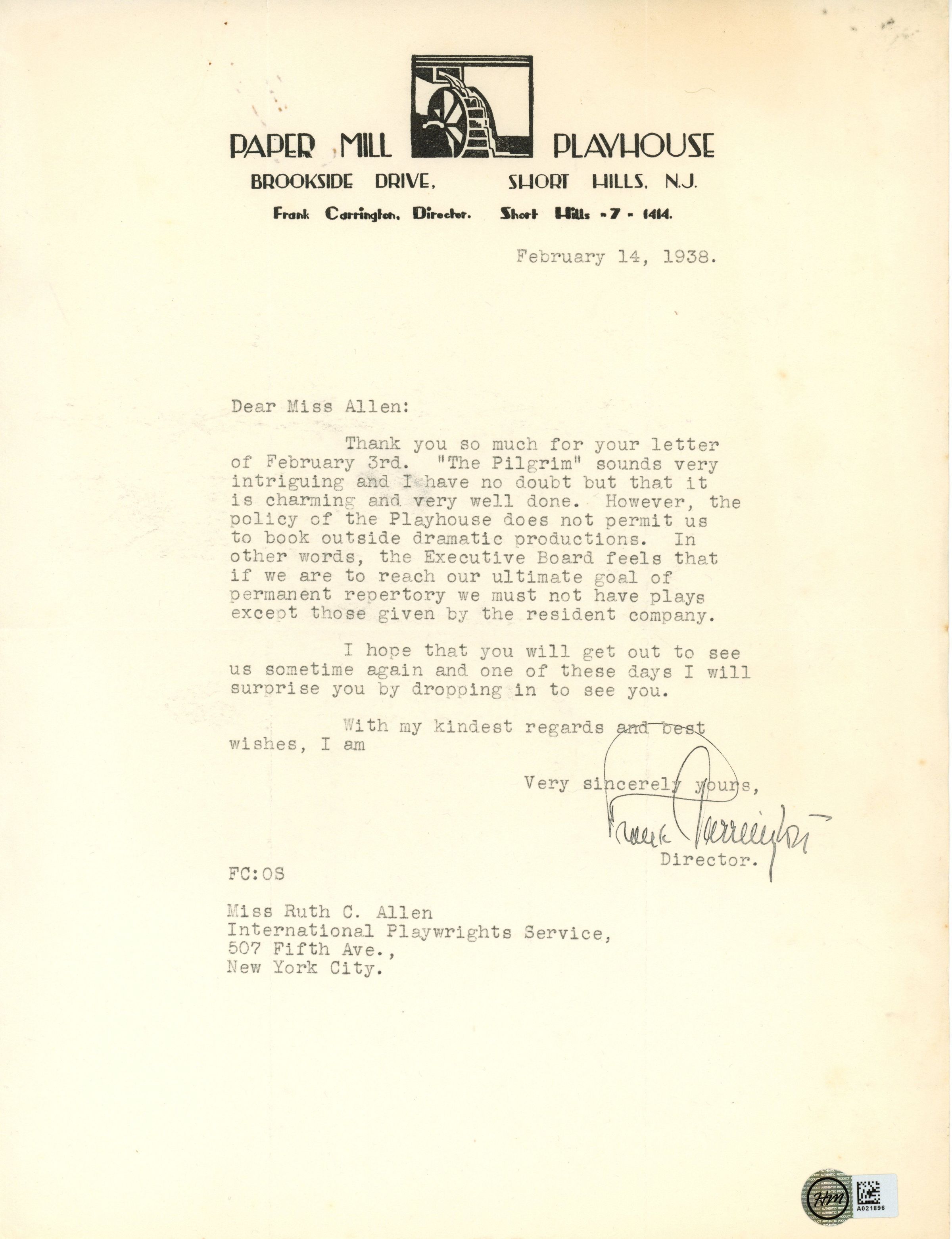 Letter from Frank Carrington to Ruth C. Allen of the International Playwrights Service dated February 14, 1938 regarding the Playhouse policy of not booking outside dramatic productions. Signed by Carrington.Acquisition