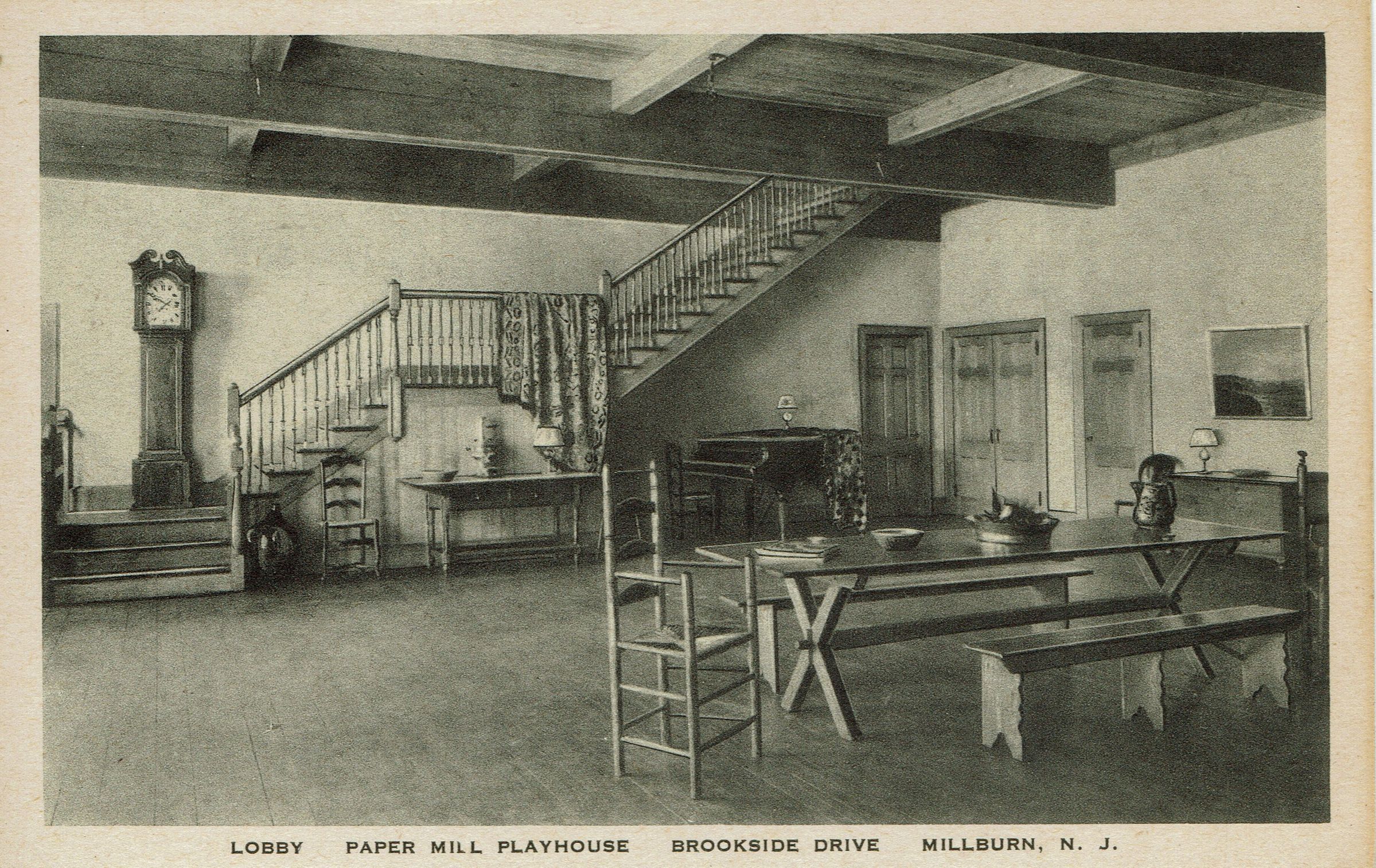 Postally unused, b&w photographic postcard of the lobby of the Paper Mill Playhouse on Brookside Drive in Millburn, NJ. Popular image. Several copies in the collection.Collection