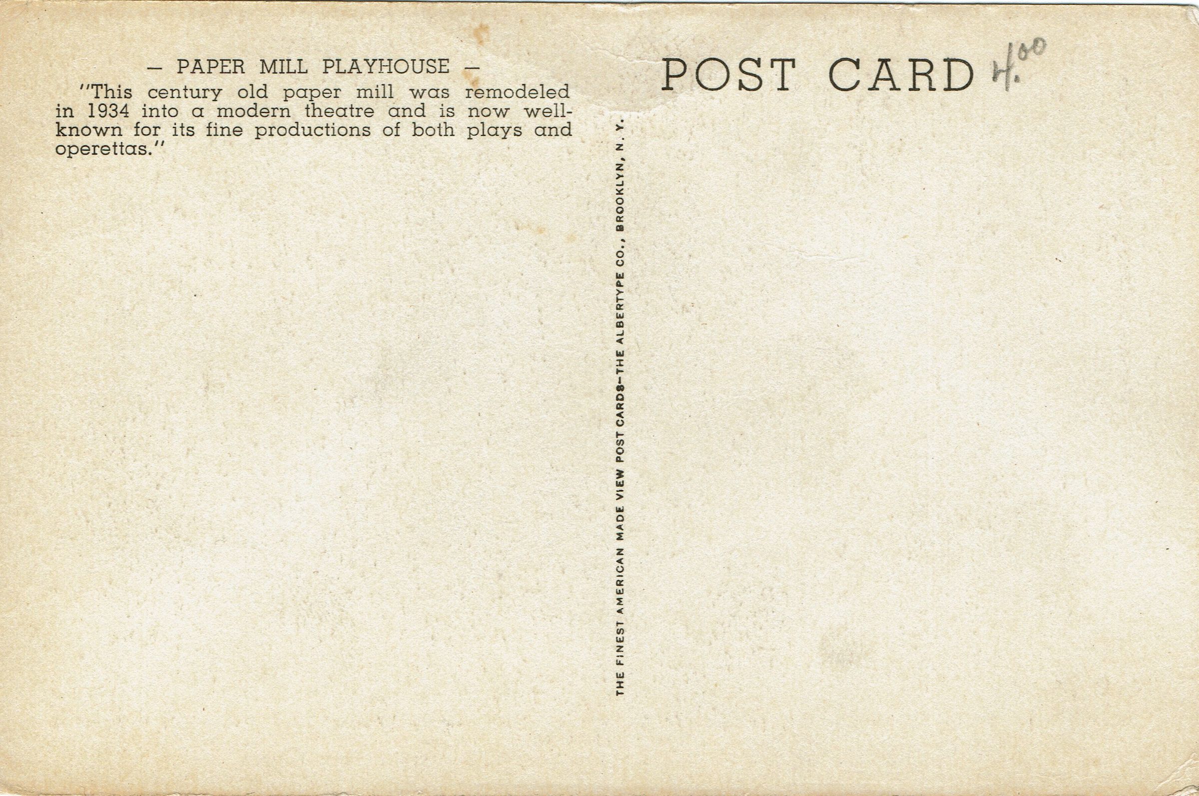 Caption on verso reads: "This century old paper mill was remodeled in 1934 into a modern theatre and is now well-known for its fine productions of both plays and operettas."