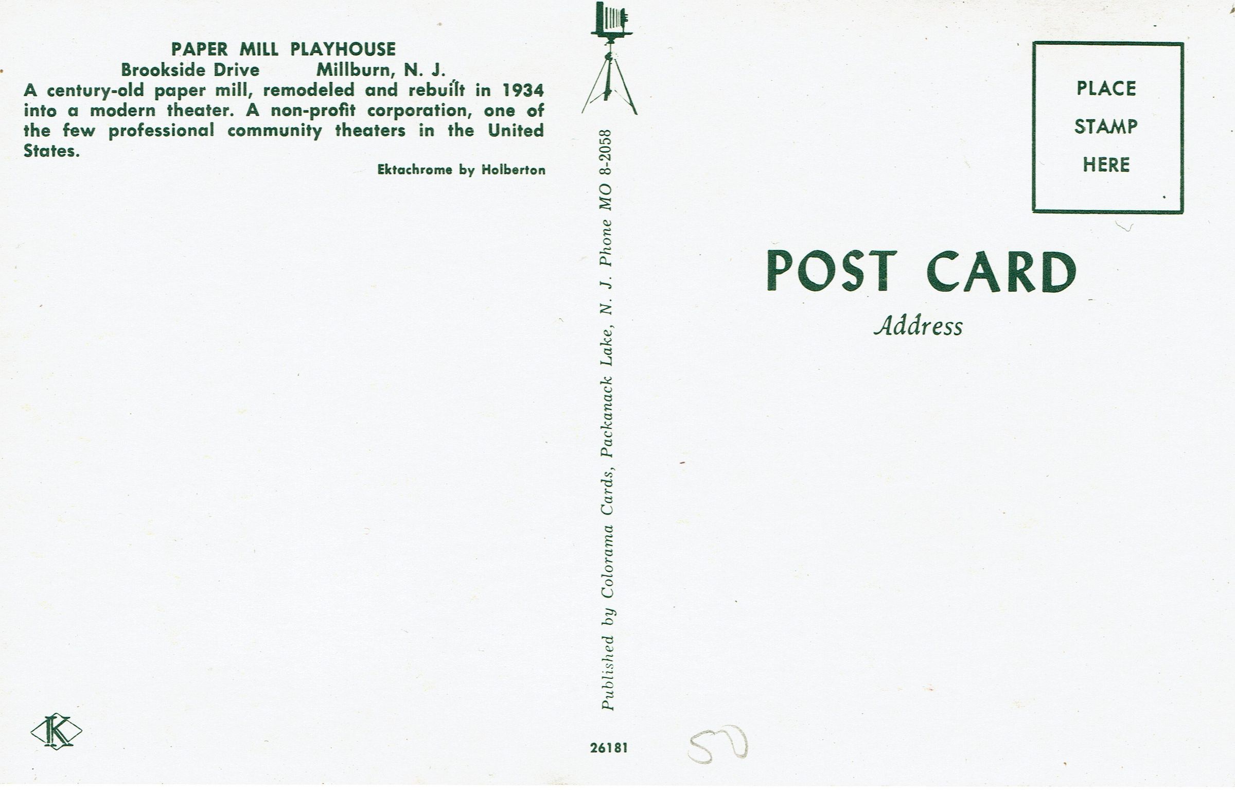 Postally unused color photographic postcard of the Main Entrance to the Paper Mill Playhouse, Millburn, NJ.
