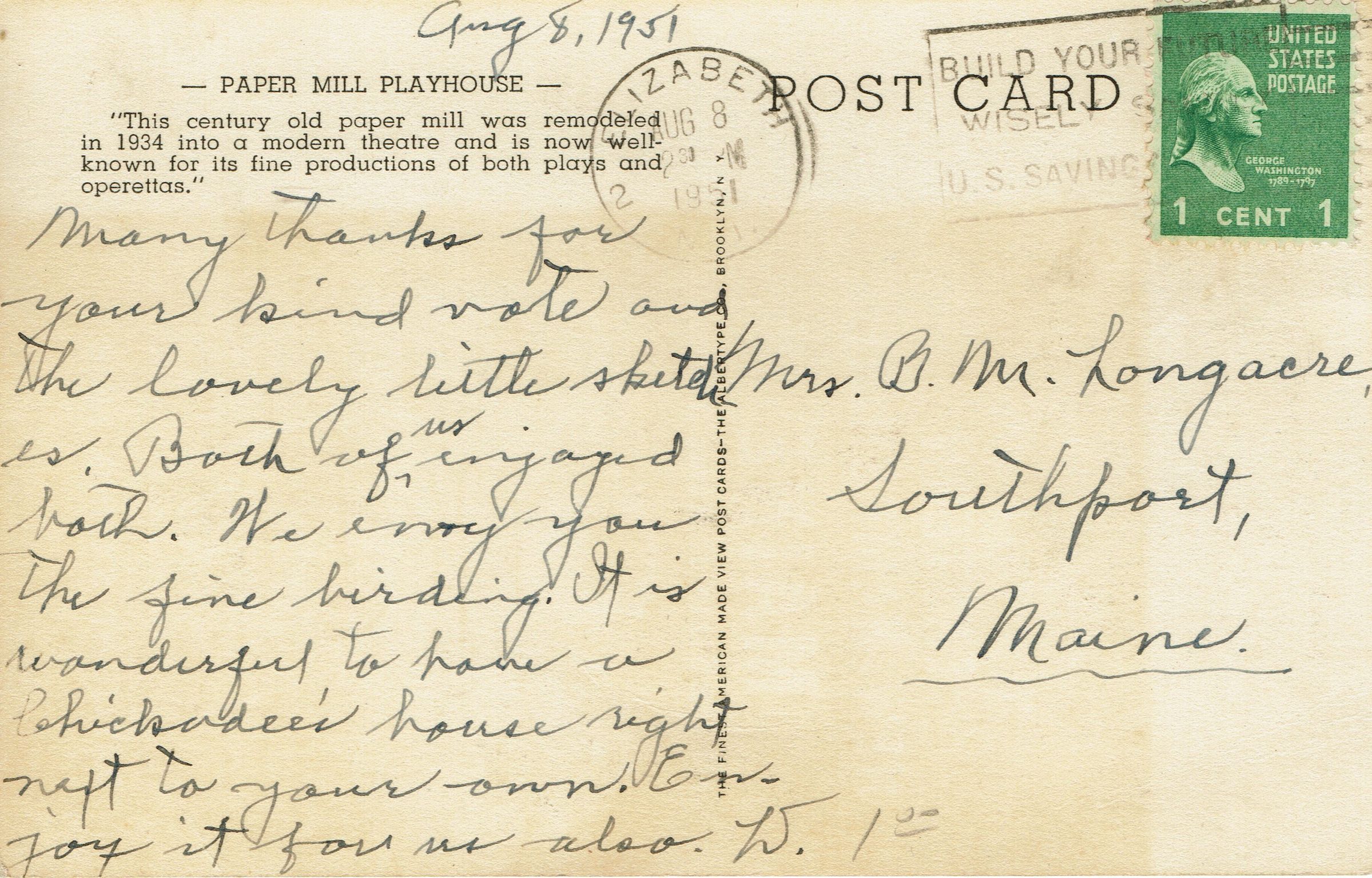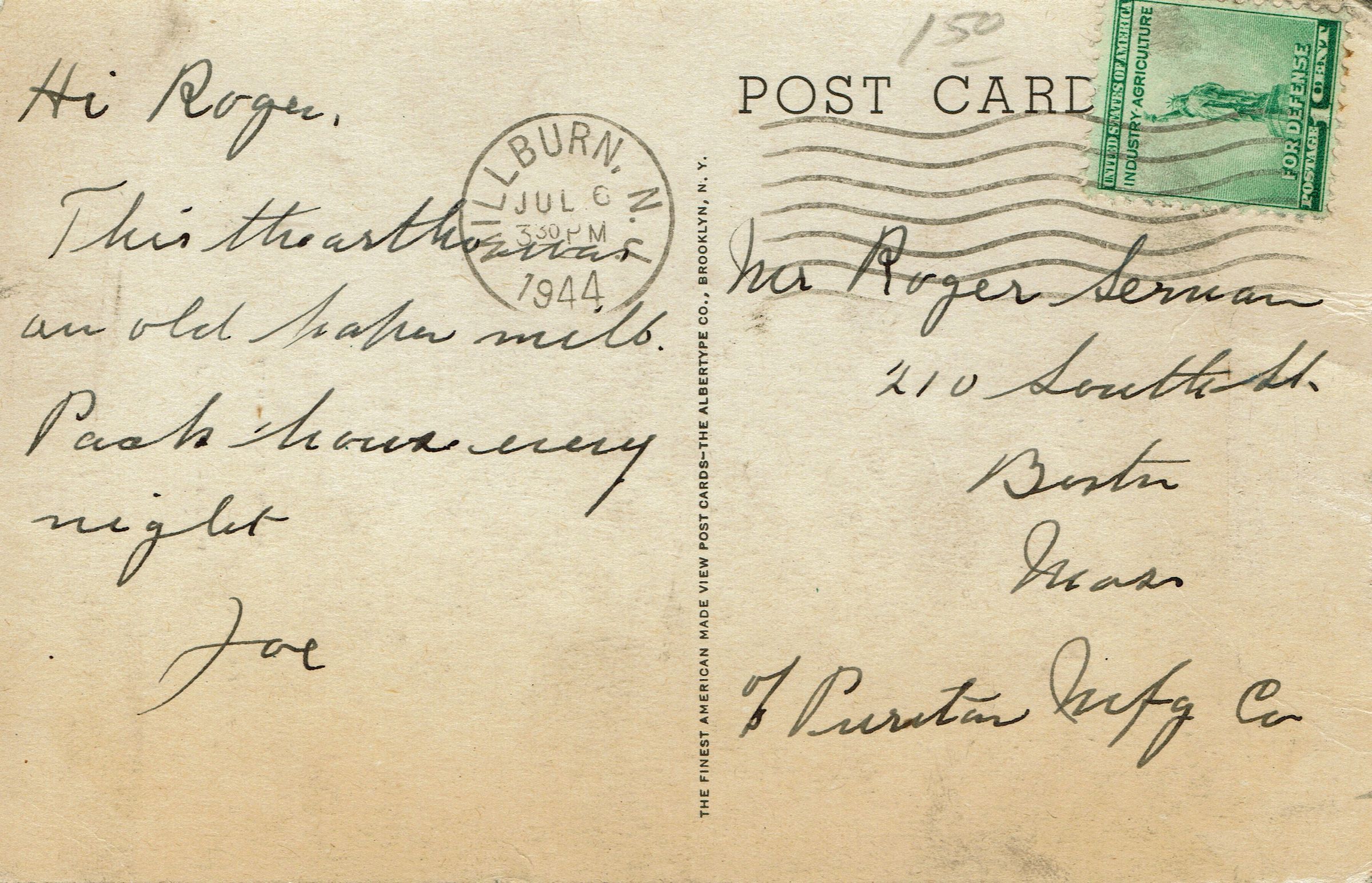Postally used, b&W photographic postcard of the main entrance to the Paper Mill Playhouse, Brookside Drive, Millburn, NJ. Postmarked Millburn, July 6, 1944, 3:30 pm. Card is addressed to Mr. Roger Serman, 210 South Street, Boston, Massachusetts. Message reads, "Hi Roger, This theater was an old paper mill. Pack house every night. Joe."