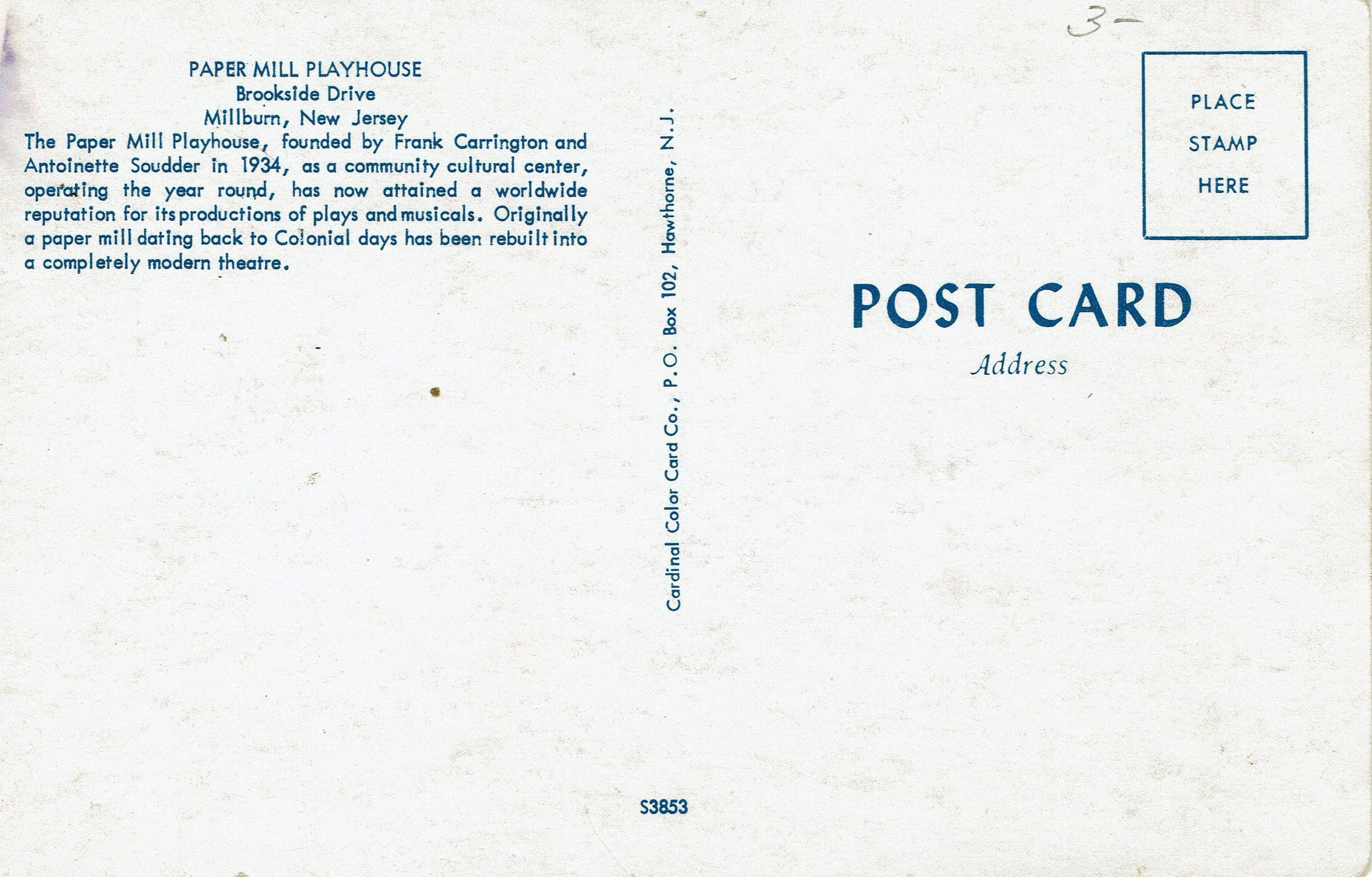 Postally unused color postcard of the Main Entrance to the Paper Mill Playhouse, on Brookside Drive in Millburn, NJ. Kismet was playing at the time (Possibly 1956).Collection