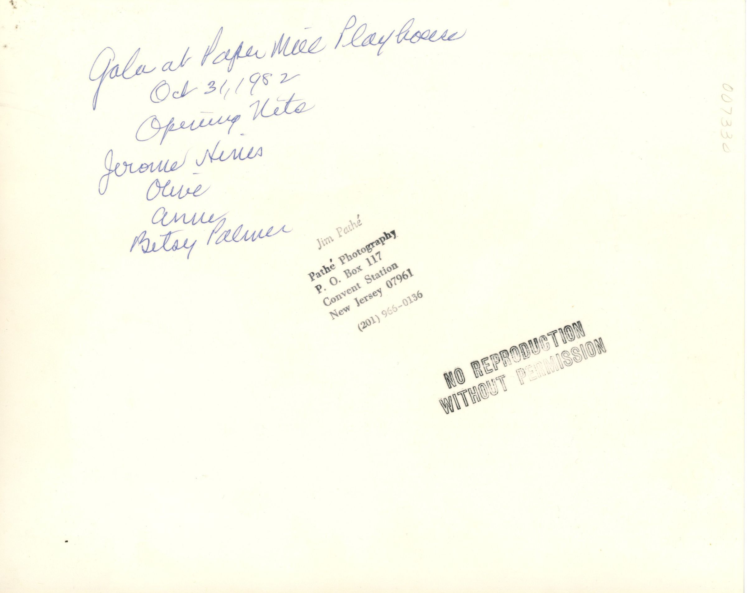 B&W photograph of the 1982 Opening Night Gala at the Paper Mill Playhouse in October 1982. Inscription on verso of photograph states: "Gala at Paper Mill Playhouse, October 31, 1982, Opening Night. Jerome Hines, Olive, Anne, Betsey Palmer."