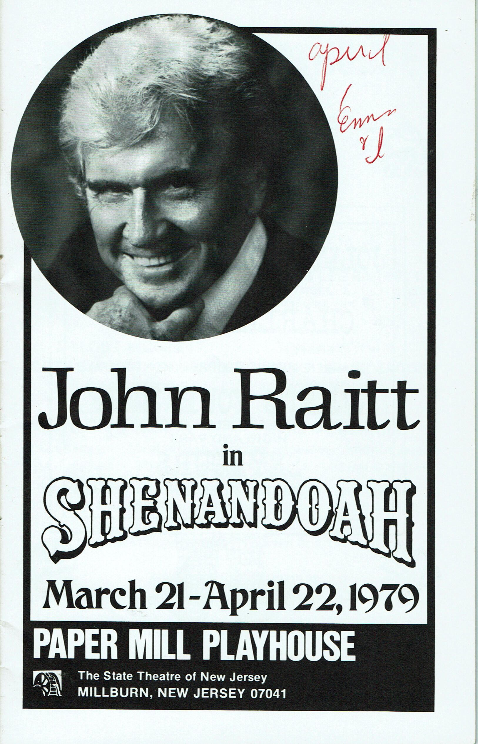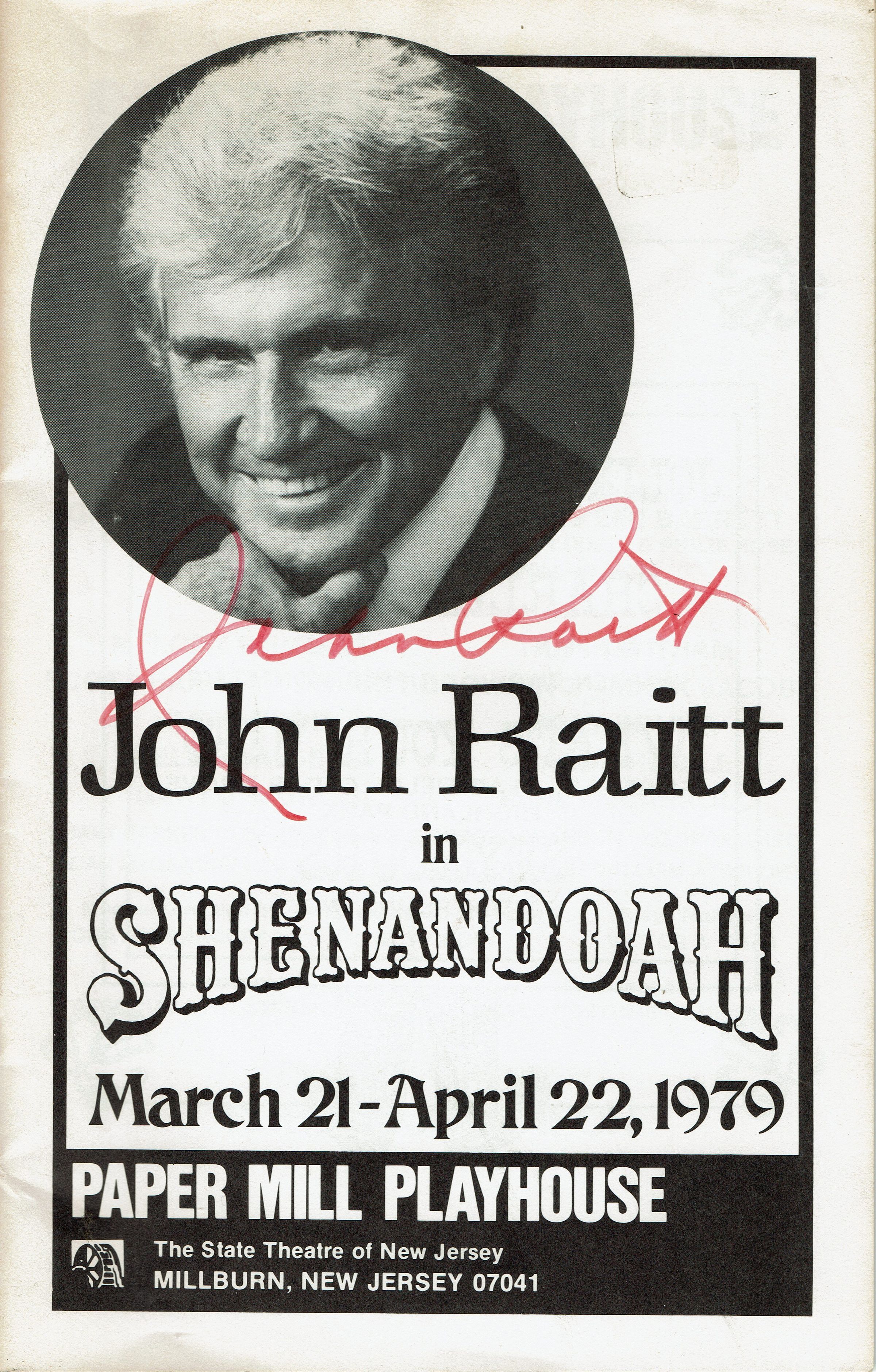 Paper Mill Playhouse Playbill Program for Shenandoah (March 21-April 22, 1979) with John Raitt. Autographed signature by John Raitt in red marker on front cover. 30 pp. (unpaginated), illustrated with B&W advertisements for local businesses.