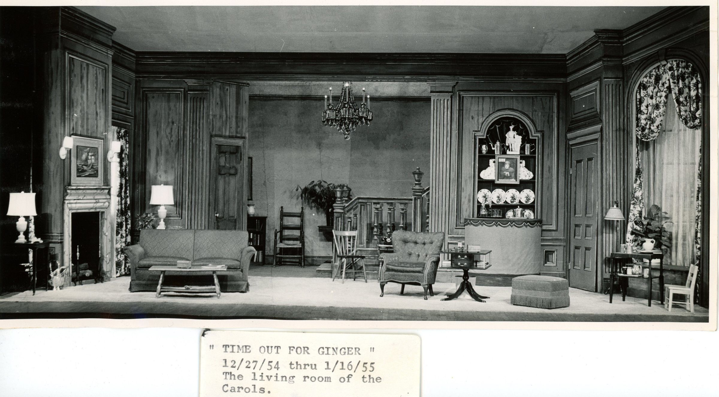 Press photograph of the Living Room of the Carols set in the Paper Mill Playhouse Production of "Time Out for Ginger, December 27-1954-January 16, 1955.Acquisition
