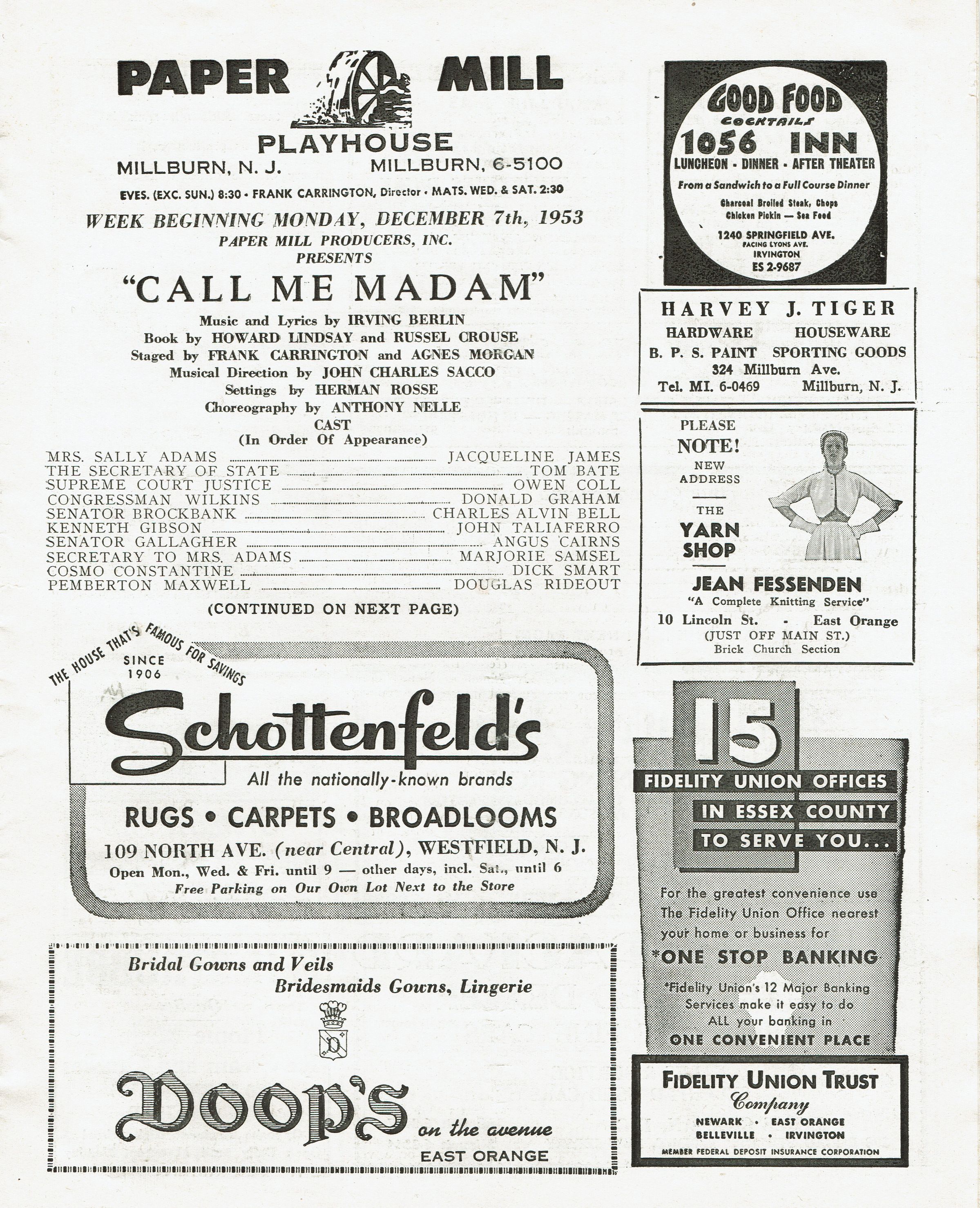 Paper Mill Playhouse Program for Call Me Madam, week starting December 7, 1953 with Jacqueline James, Dick Smart and John Taliaferro. 12-page program with cast and production information. Extensively illustrated with B&W area advertisements.Acquisition