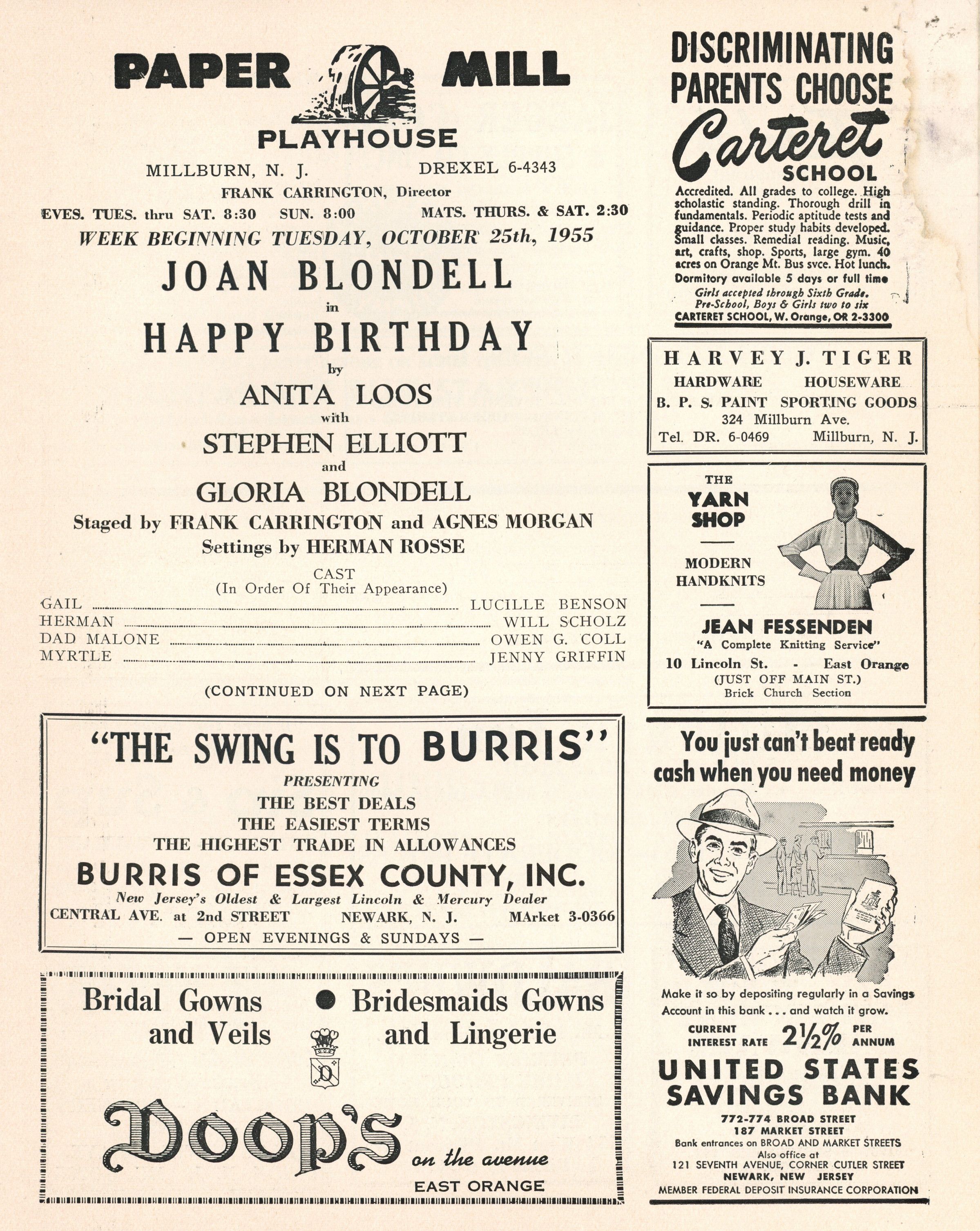 Paper Mill Playhouse Program: Happy Birthday, 1955Entry/Object ID