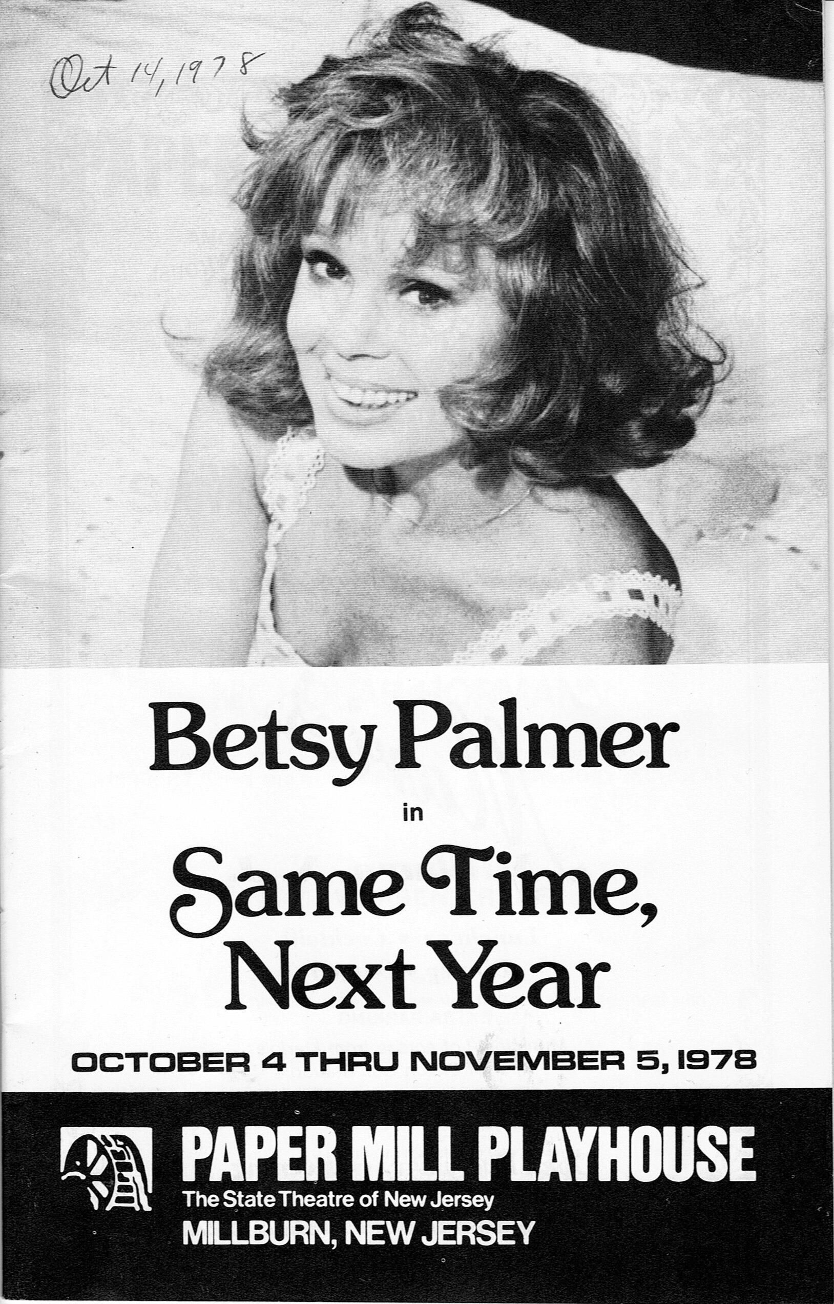 Paper Mill Playhouse Playbill Program for Same Time Next Year (October 4-November 5, 1978) with Betsy Palmer and Nicolas Hormann. 30 pp. (unpaginated), illustrated with B&W advertisements for local businesses.Collection