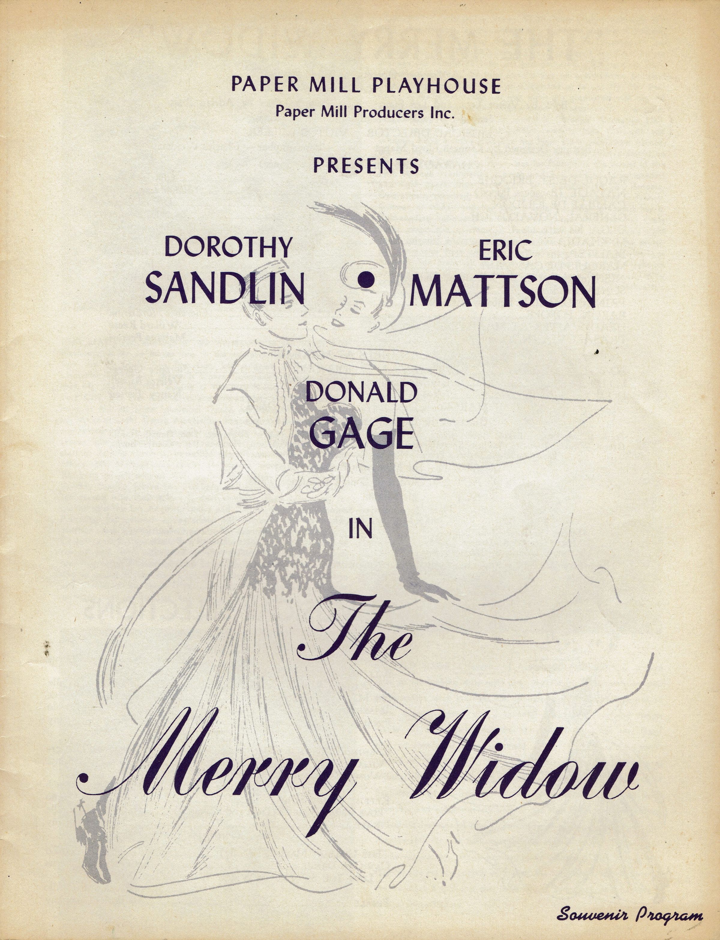 Souvenir Program for 1944 Paper Mill Playhouse Production of "The Merry Widow" with Dorothy Sandlin, Eric Mattson, Donald Gage, Yolanda Lupachini, Albert Carroll, and Clarence Nordstrom. Deluxe fully illustrated program with photographs of cast members, producers and articles about Paper Mill Playhouse, including 4 pages of photographs of "The Old Paper Mill Before and During Remodeling," 24 pp.Collection