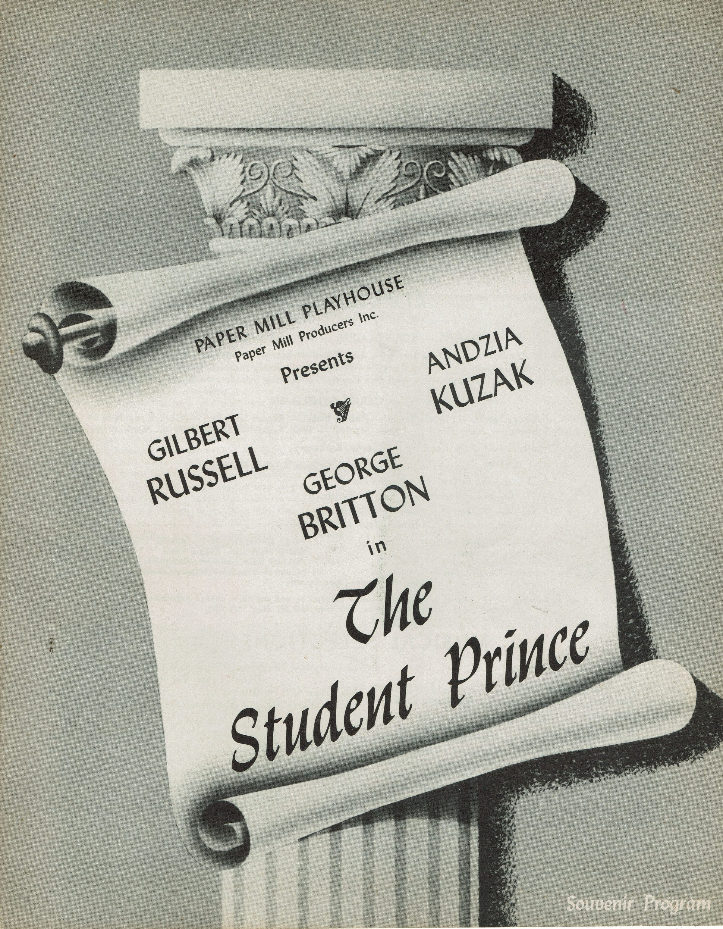 Souvenir Program for 1945 Paper Mill Playhouse Production of "The Student Prince" with Gilbert Russell, Andzia Kuzak and George Britton. Deluxe fully illustrated program with photographs of cast members, producers and articles about Paper Mill Playhouse, 24 pp.Collection