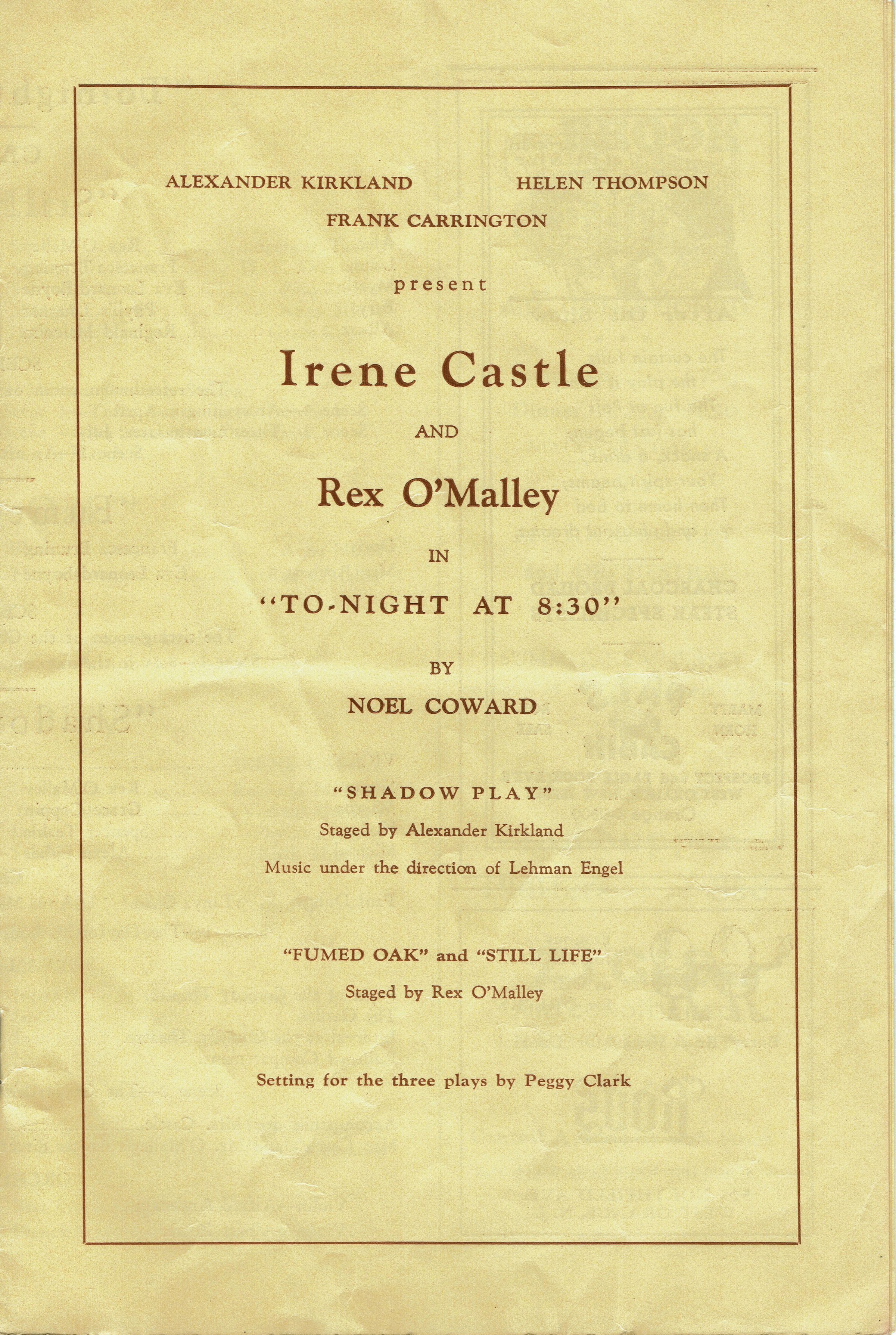 Program for the 1939 Paper Mill Playhouse Production of Noel Coward's "Tonight at 8:30" starring Irene Castle and Rex O'Malley. 12 pp., illustrated with advertisements. The play was part of the First New Jersey Theatre Festival sponsored by Eleanor Roosevelt. See also press photographs of Irene Castle in collection.Collection