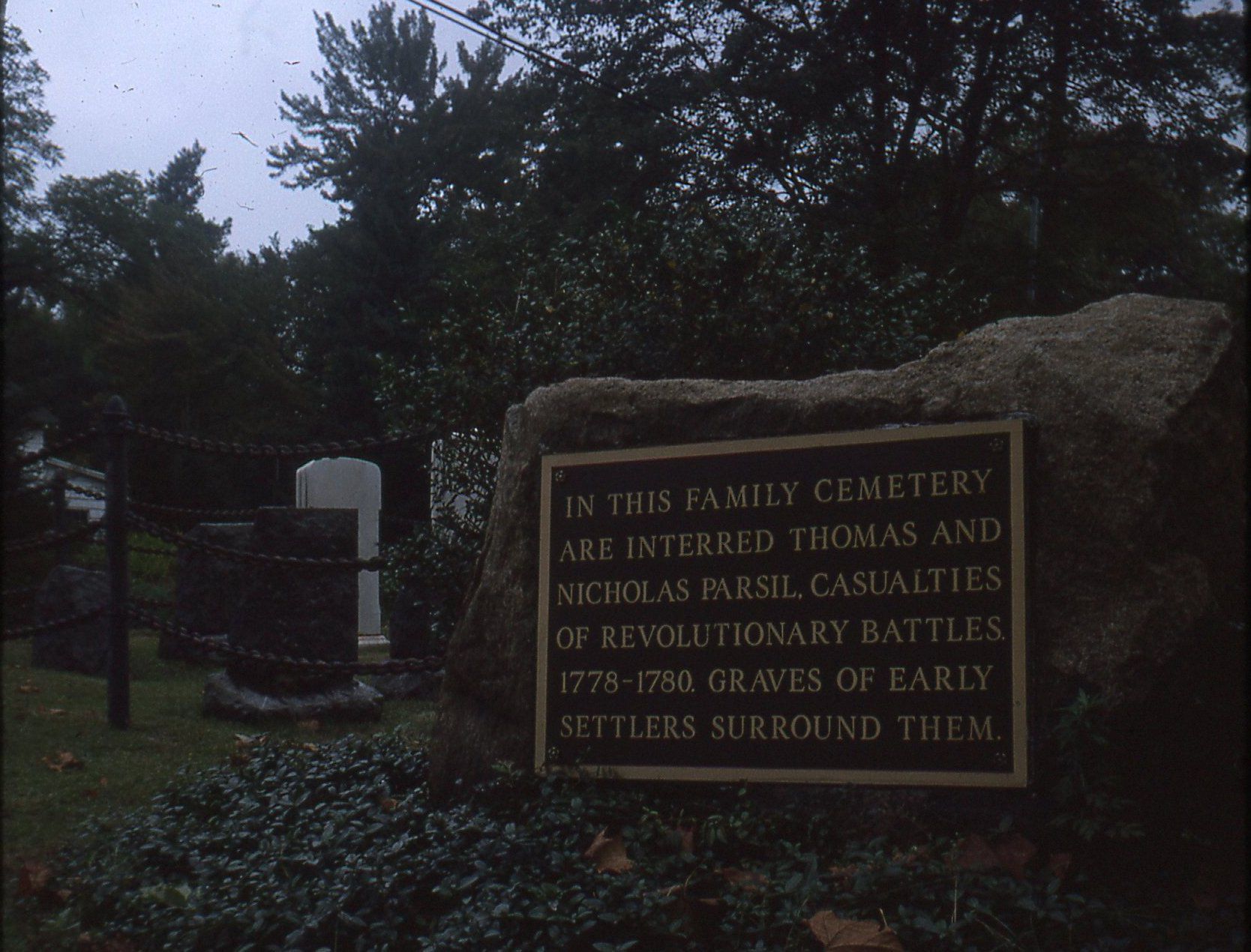 Photographs of the Parsil family cemetery marker on White Oak Ridge Road taken by Juli Towell in September 1975 and Harvey Reed in 1975.Photograph Details