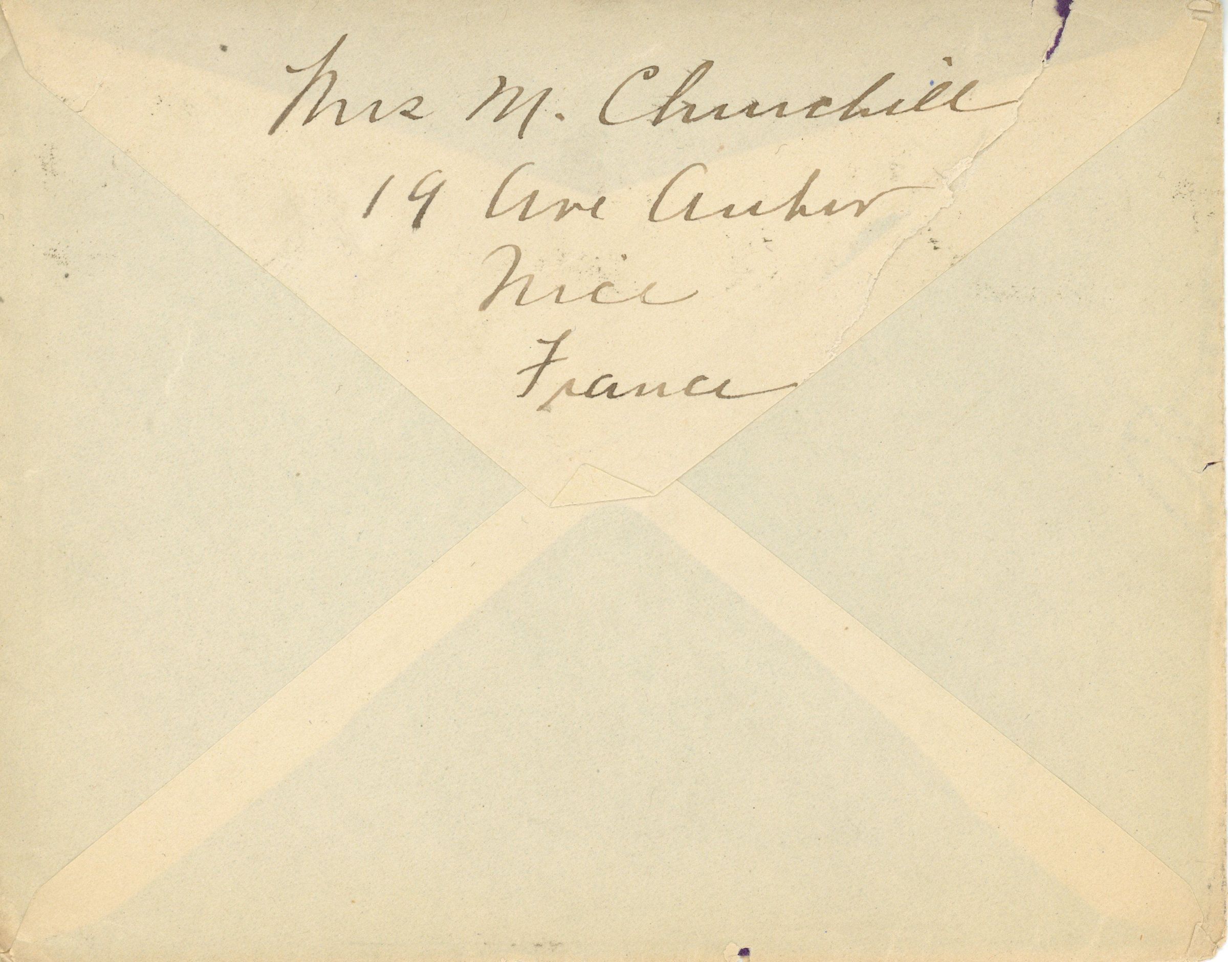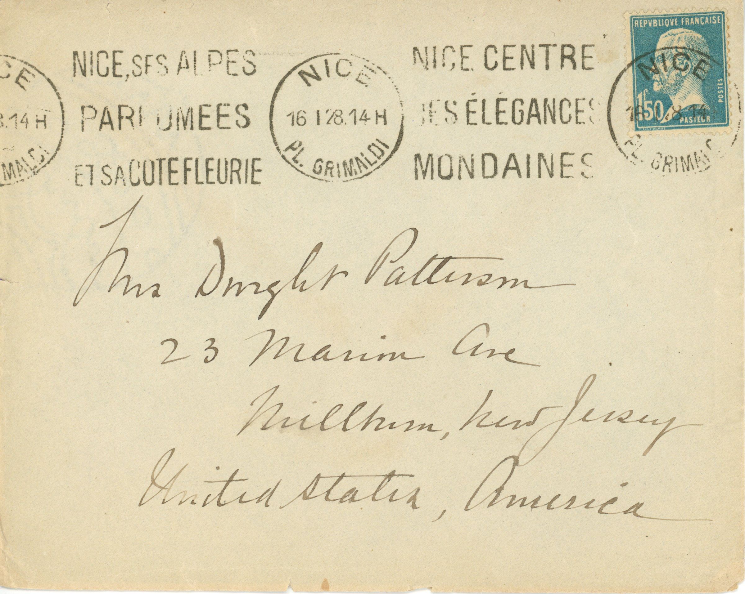 Envelope addressed to Mrs. Dwight Patterson, 23 Marion Avenue, Millburn, New Jersey, United States, America postmarked Nice, Pl. Grimaldi, January 28, 1914. Return address Mrs. M. (Marlborough) Churchill, 19 Avenue Auber, Nice, France. Marlborough Churchill and his wife, Caroline Bartley Churchill were also residents of Short Hills.Acquisition