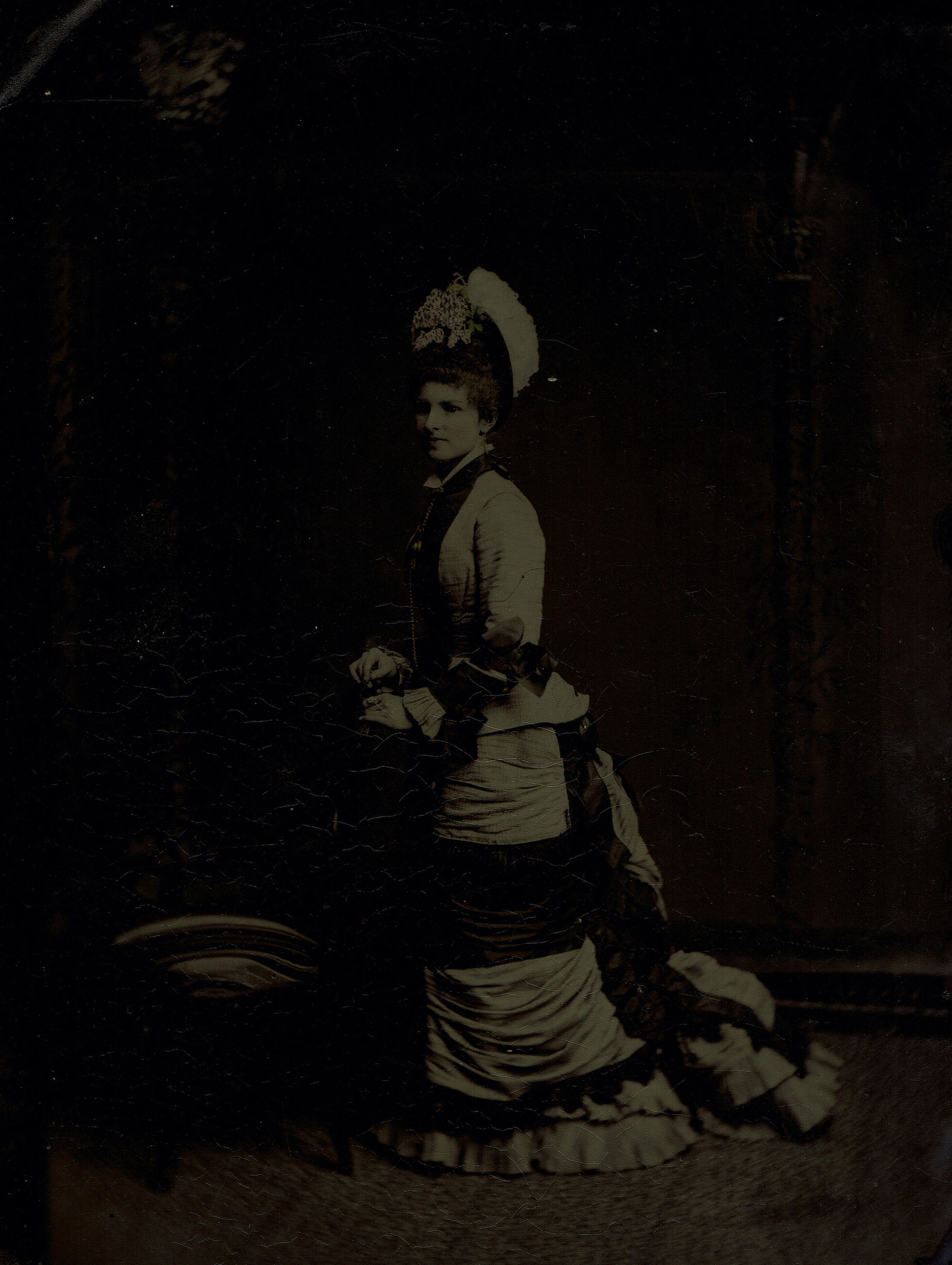Photograph of an unidentified fashionably-dressed female standing and holding the back of a chair. Probably from the 1870s-1880s. Figure has not been identified. May have been acquired for comparative purposesPhotograph Details