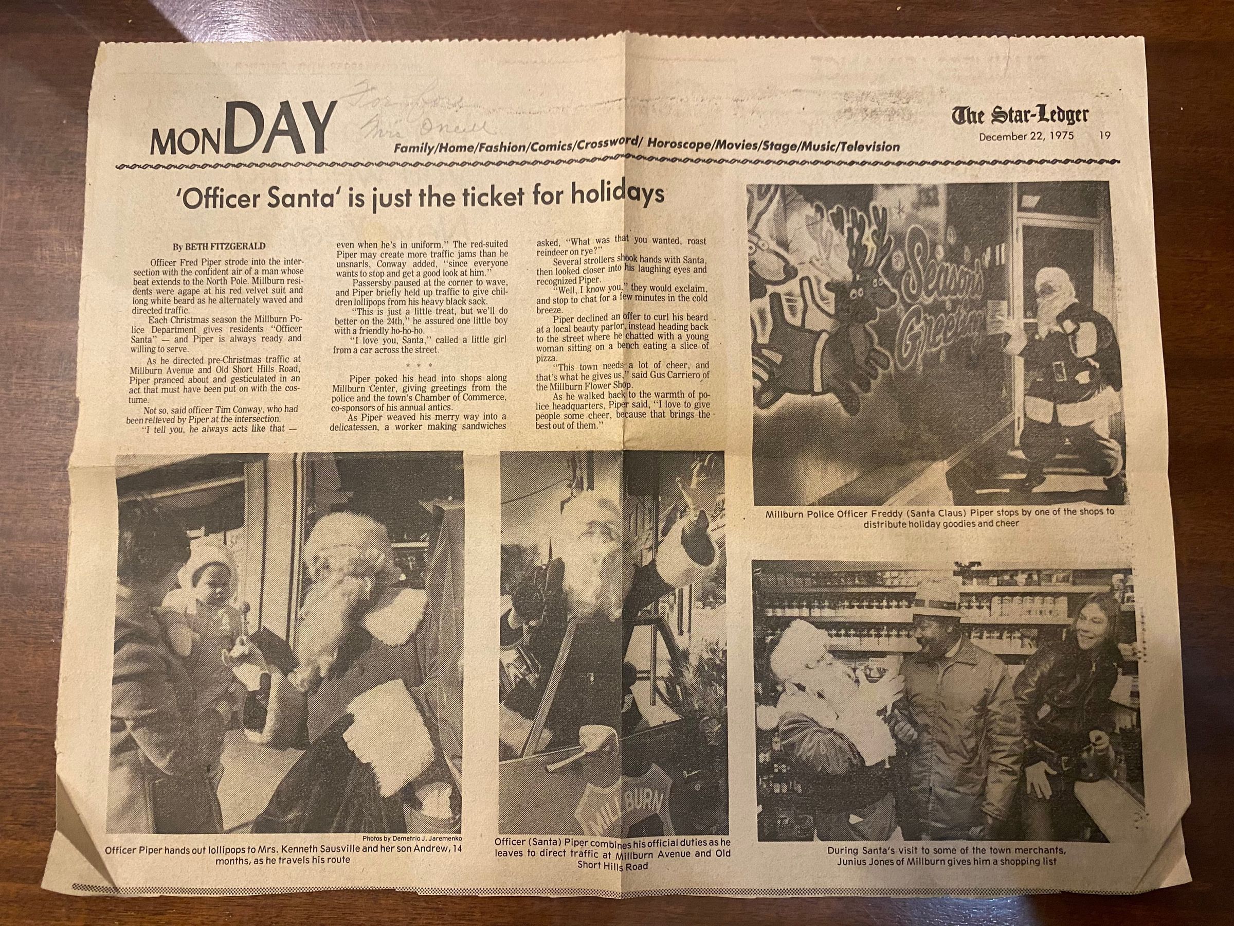 A newspaper article in the Star-Ledger by Beth Fitzgerald titled "'Officer Santa' is just the ticket for holidays" published in December 22, 1975. The article pictures Officer Fred Piper dressed as Santa Claus visiting residents around Millburn/Short Hills.Acquisition