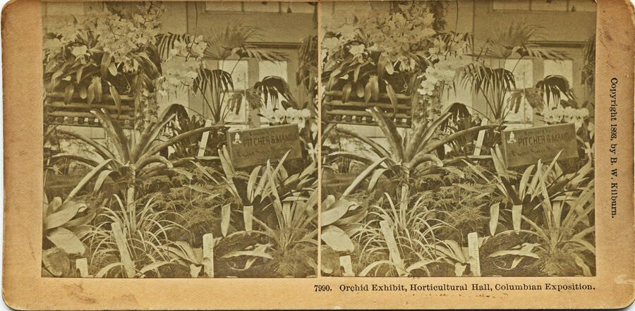 Sepia photographs mounted on a orange-beige stereograph card, labeled "Orchid Exhibit, Horticultural Hall, Columbian Exposition".