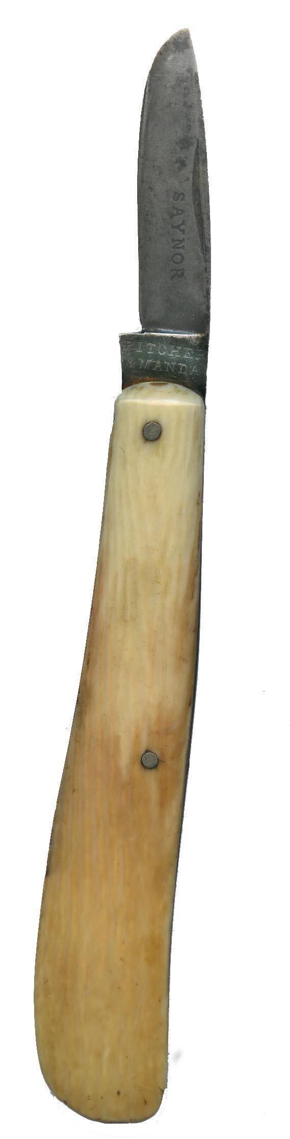 Folding/pocket, horticultural knife stamped with "Pitcher & Manda" at the base of the blade and "Saynor" on the blade. The opposite side of the blade base that is stamped "Pitcher & Manda" is stamped "England; Saynor; Cooke &; Ridal." The knife is 3.5" long when closed and 5.5" long when open. The handle appears to be made of bone and has two small rivets in it that are ca. 1.5" apart. Re Cooke & Ridal: "...Though the business started in the 1700s as a table, pen and pocket knife manufacturer, it was in the 1800s that the company became focused on making horticultural knives and in fact won many awards worldwide for their work..." and "Saynor Cooke & Ridal was based at Paxton Works starting in 1891 under Stanley and Gladys Wightman who withdrew from the business in 1938 though the name of Saynor Cooke & Ridal and Paxton Works continued after WWII" (courtesy of https://allaboutpocketknives.com/knife_forum/viewtopic.php?t=46470). The blade is discolored, and shows evidence of having been sharpened along the cutting edge.Acquisition