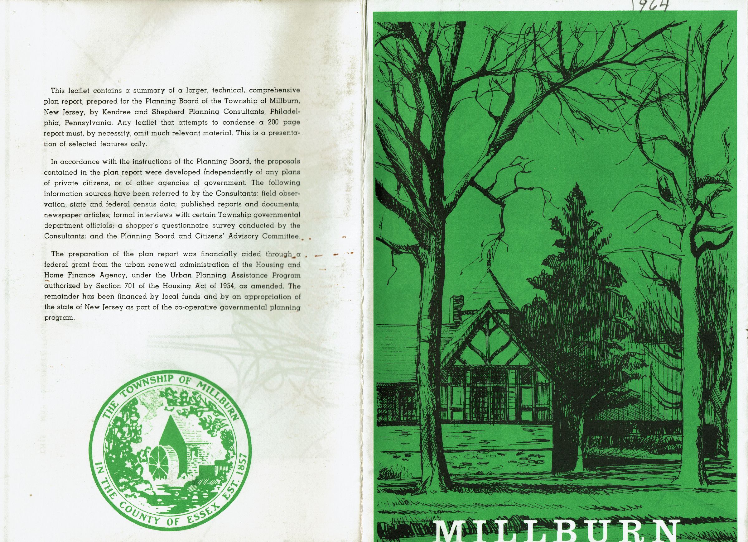 Report for the Millburn Township Planning Board conducted by Kendree and Shepherd Planning Consultants, Philadelphia in 1964. Folded pamphlet that opens to 19 x 24" map entitled "Plan for Millburn--Circulation, Community Facilities, Land Use." Topics covered: Traffic Analysis, Shopping-Parking Plan, Community Facilities Plan, Land-Use Plan.Acquisition