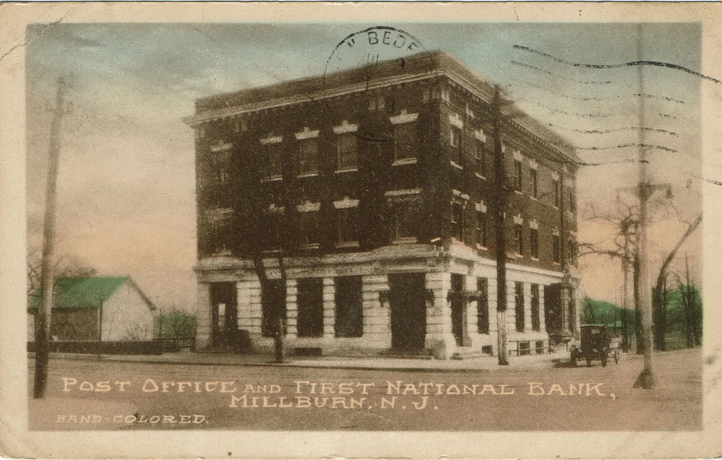 Hand-colored photographic postcard of the First National Bank and Post Office on the corner of Main Street and Millburn Avenue (340 Millburn Avenue) . Postally used, postmarked Highlands NJ, July 5, 1925 and addressed to Mrs. H. E. Jacobs, 37 Prince Street, Needham, 92 Massachusetts. Message reads, "Short Hills is a suburb of this town. Have (?) room.feel fine. Going to a beach to swim today, Love Elmer."Collection