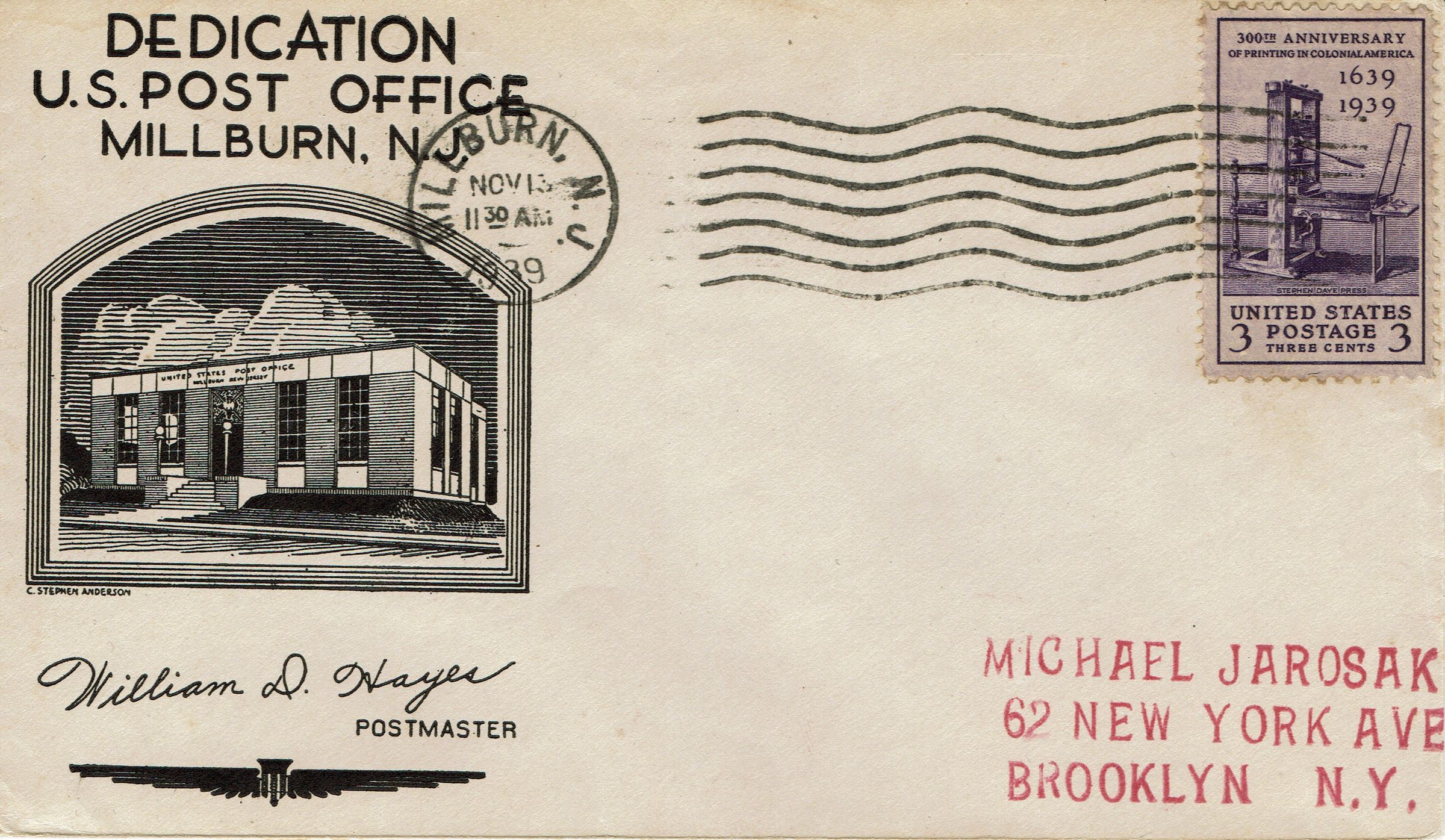 First day covers from the dedication of the U.S. Post Office, Millburn, NJ. Postmarked Millburn, N.J., November 13, 1939. Contains graphic cachet of the building with William D. Hayes, Postmaster.Acquisition