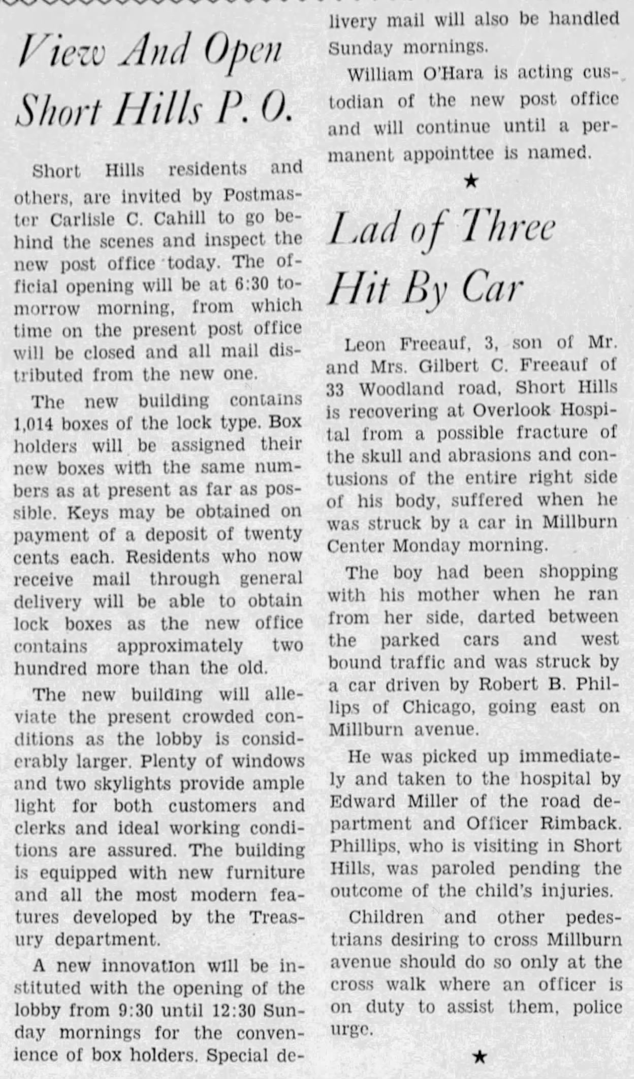 First Day Cover commemorating the opening of the new post office building in Short Hills, New Jersey on July 30, 1938, Postally used and addressed to Miss Anna Hoch, c/o Auerbacher 206 4th Ave., Belmar, NJ. Signed by postmaster Carlisle C. Cahill and postmarked Short Hills, N.J. July 30, 1938, 6 pm.Acquisition