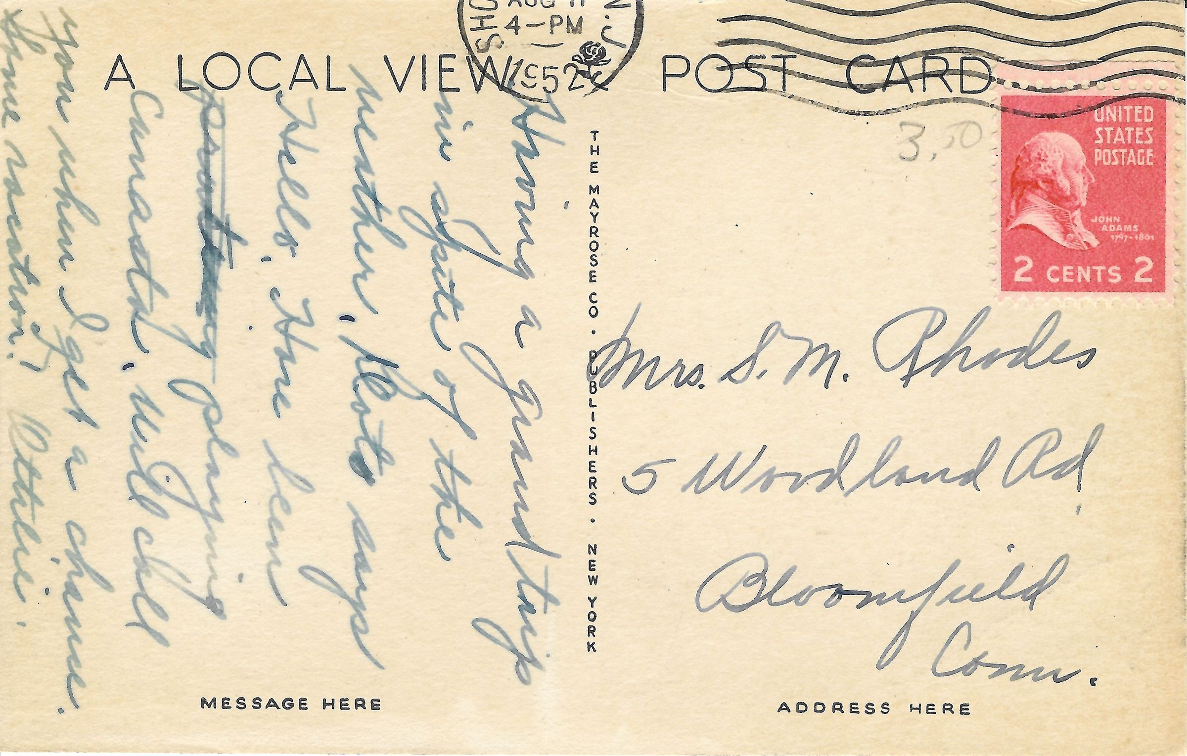 Photographic postcard of the United States Post Office in Millburn, NJ. Post marked August 11, 1952. Post card is addressed to Mrs. S.M. Rhodes, 5 Woodland Road, Bloomfield Conn.