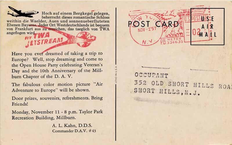 Postcard sent in 1957 to "Occupant" at 252 Old Short Hills Rd, Short Hills, from TWAEntry/Object ID