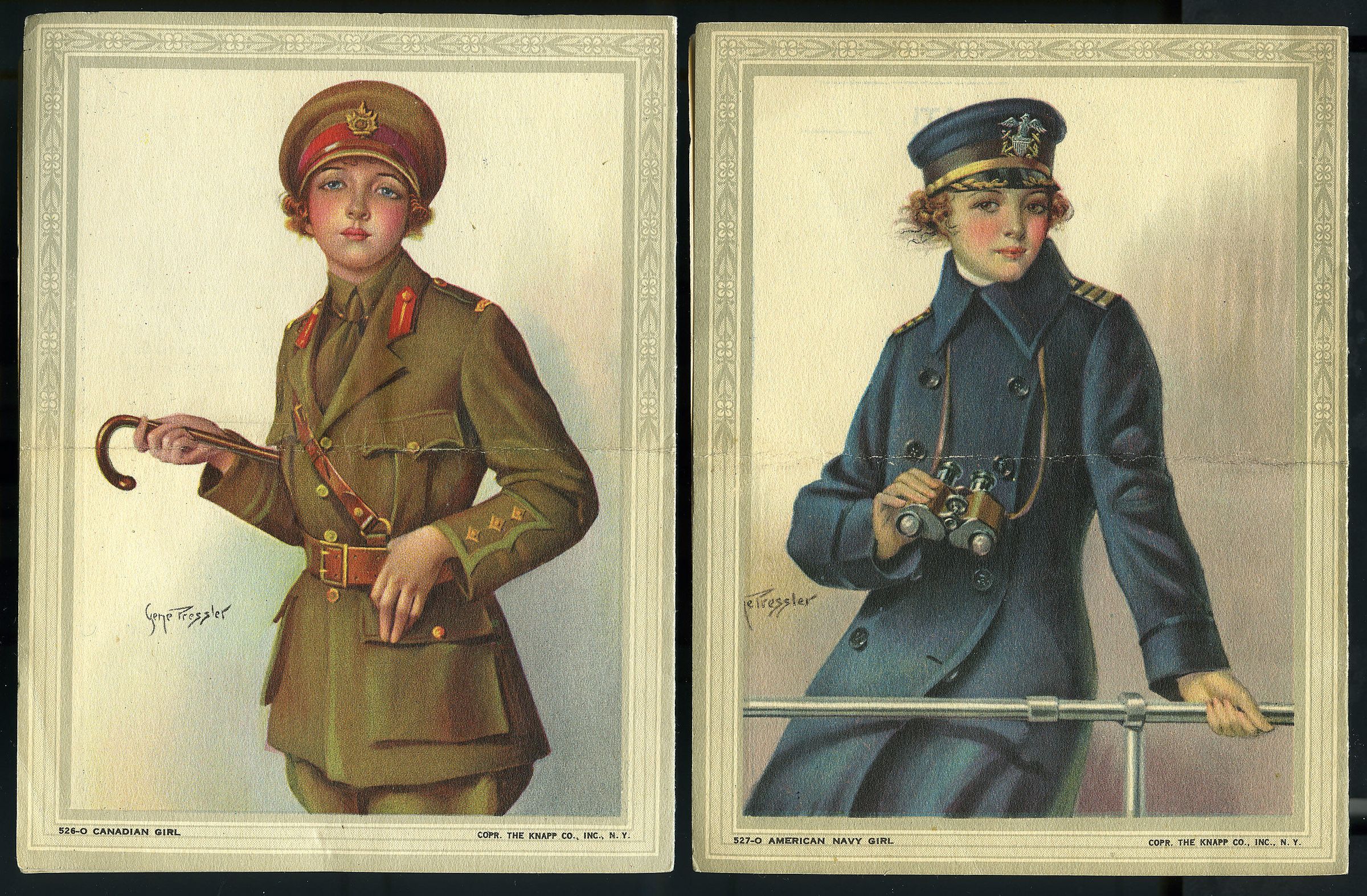 Four 1920's silent film theater cards illustrated by Gene Pressler. Each card measures 4.5" X 6". The four cards contain illustrations of women in uniforms matching the following descriptions at bottom of cards: American Army Nurse, Japanese Girl, American Navy Girl, and Canadian Girl. All four cards have crease across center horizontally. Each card contains information on Empire and Park Theatre films in insides and on backs. Soiling on all but more on American Army Nurse card. Purchased on Ebay.