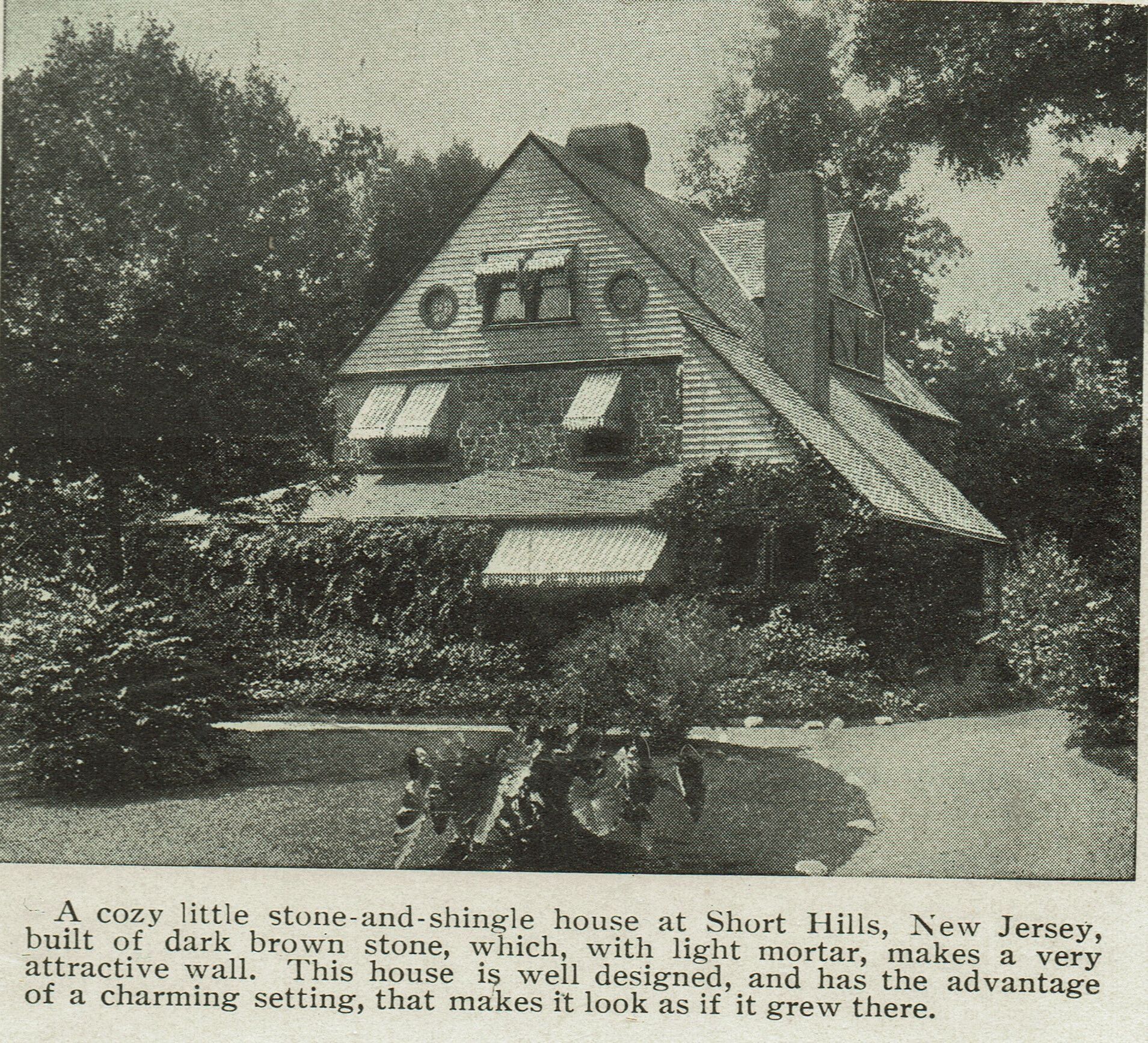 Photograph of "A cozy little stone-and-shingle house at Short Hills, New Jersey," featured in part 4 of the series "The Prettiest Homes in America: Outside of One Hundred Homes," The Ladies Home Journal, May 1899, p. 25.