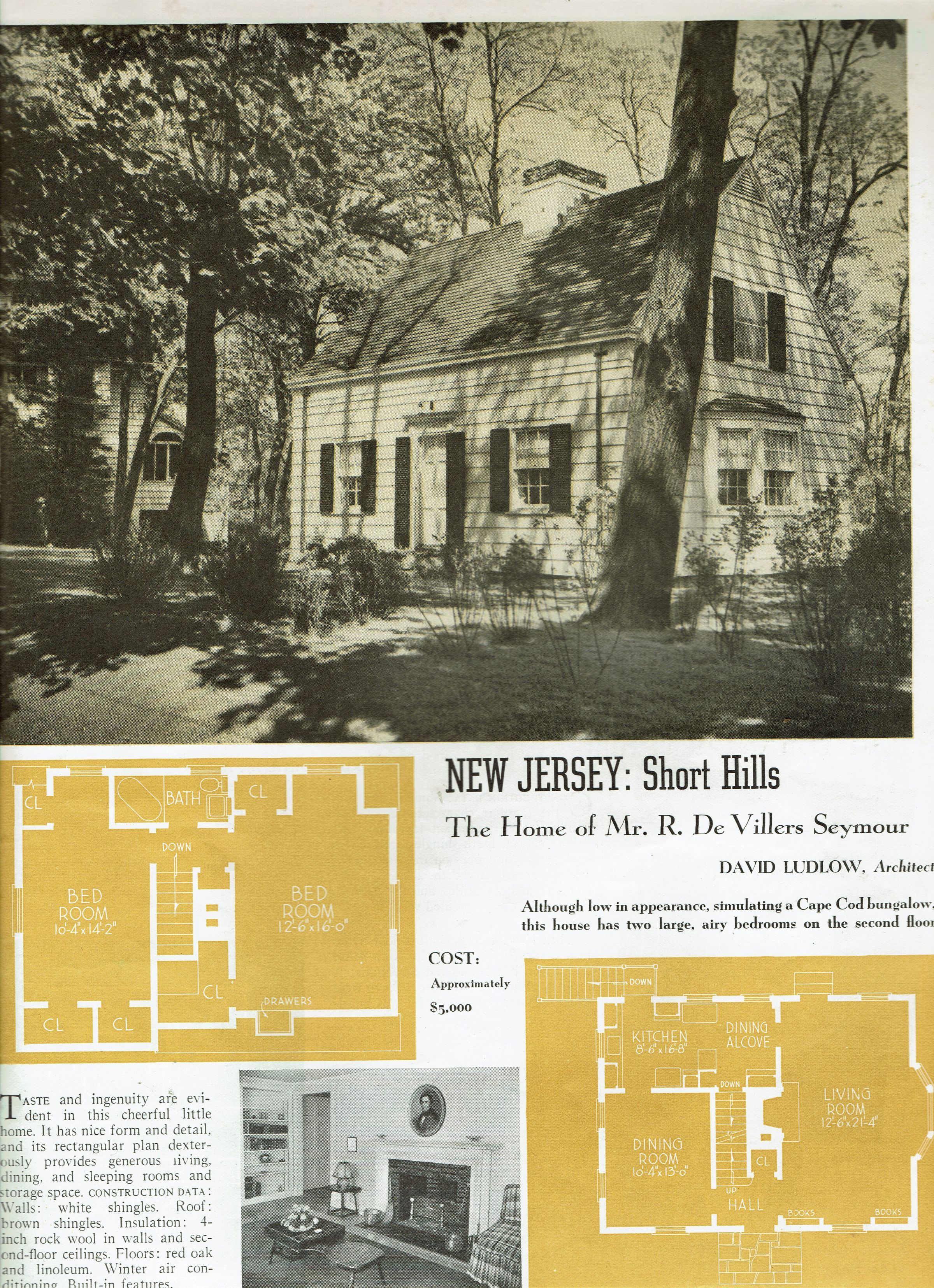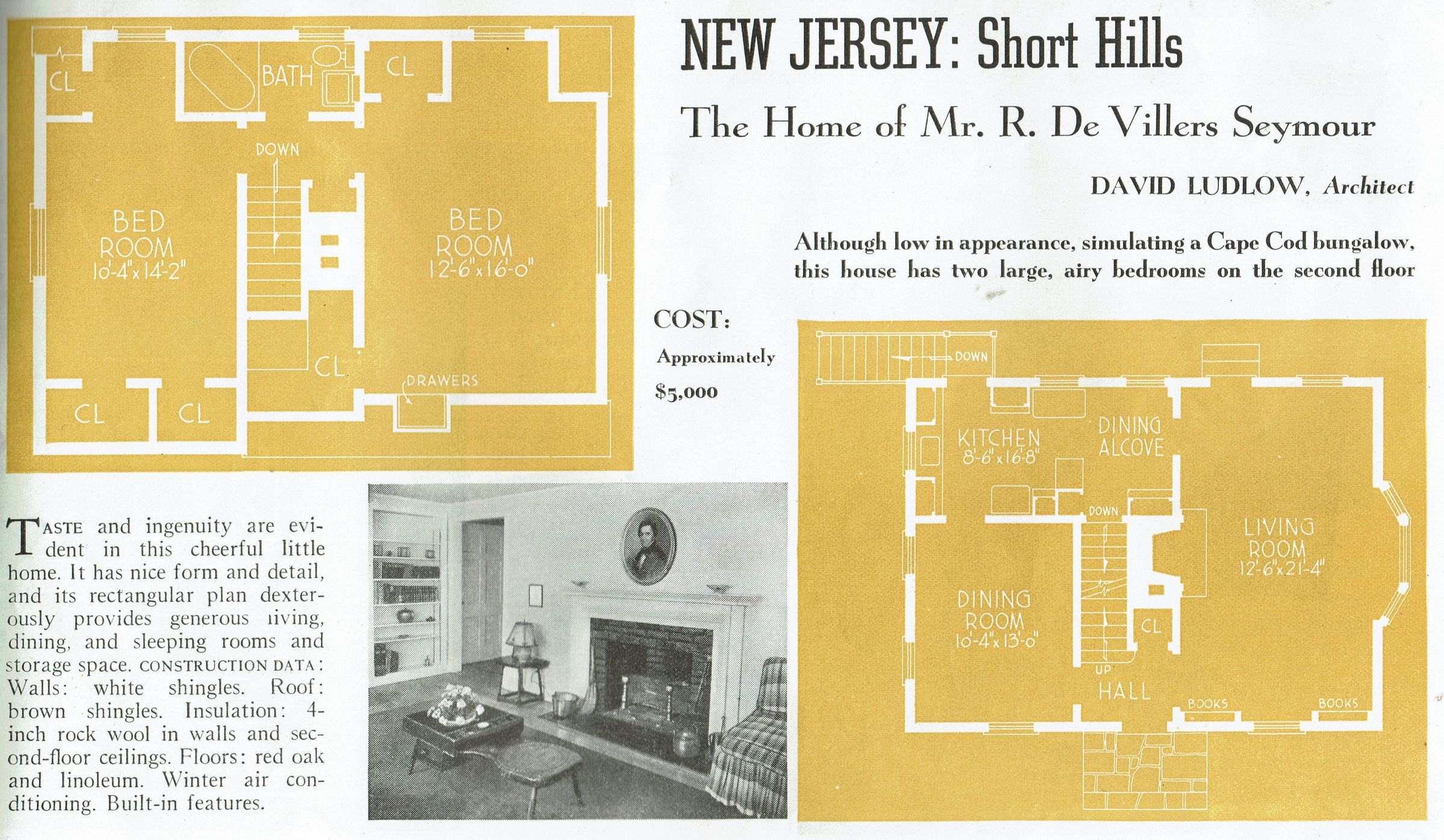 "New Jersey: Short Hills. The Home of Mr. R. De Villers Seymour. Architect: David Ludlow," The American Home, 20, 4 (September 1938), p. 31. The address of the house is not known at this time. According to the November 9, 1934 issue of The Item, architect David Ludlow had recently designed a colonial style home for Mr. and Mrs. Douglas Campbell on Hillside Avenue in Short Hills.
