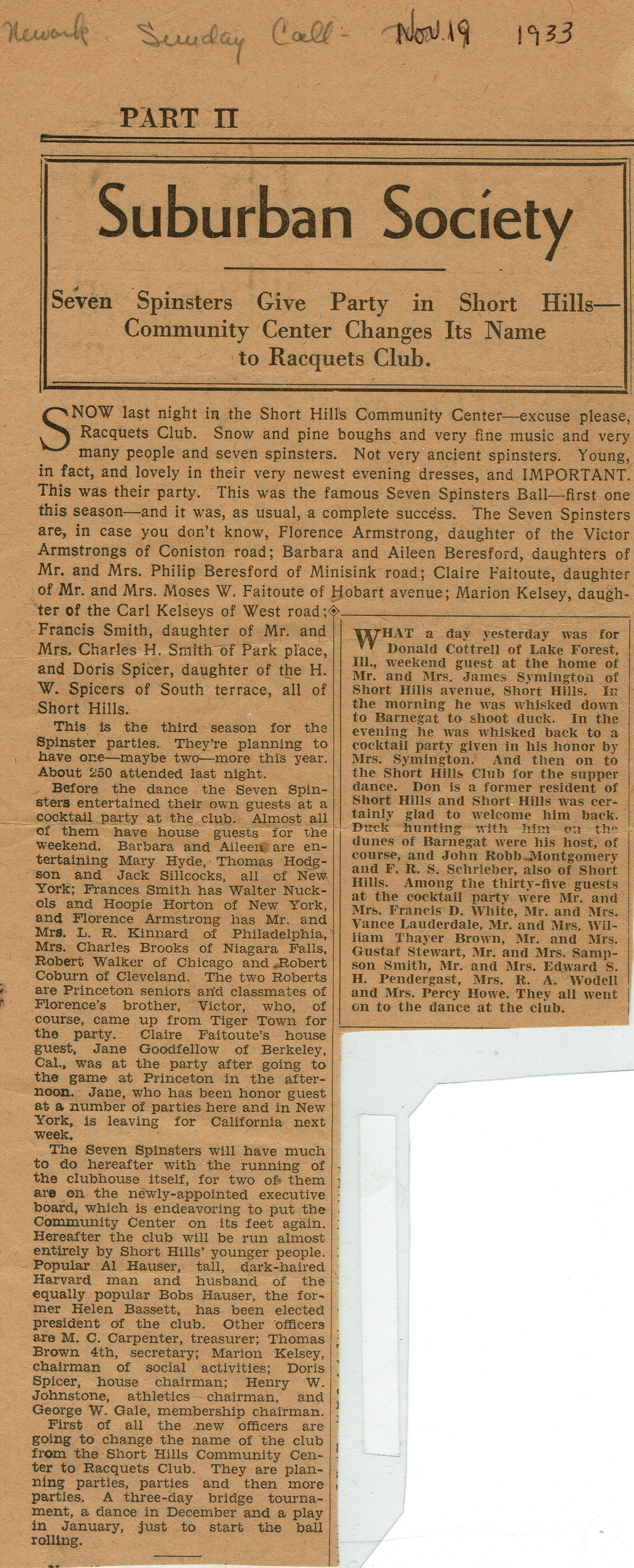 Clipping from the Newark Sunday Call, November 19, 1933, "Seven Spinsters Give Party in Short Hills--Community Center Changes Its Name to Racquets Club." Article also discusses the Seven Spinsters Ball organized by: Florence Armstrong, Barbara and Aileen Beresford, Clair Faitoute, Marion Kelsey, Francis Smith, and Doris Spicer.Acquisition