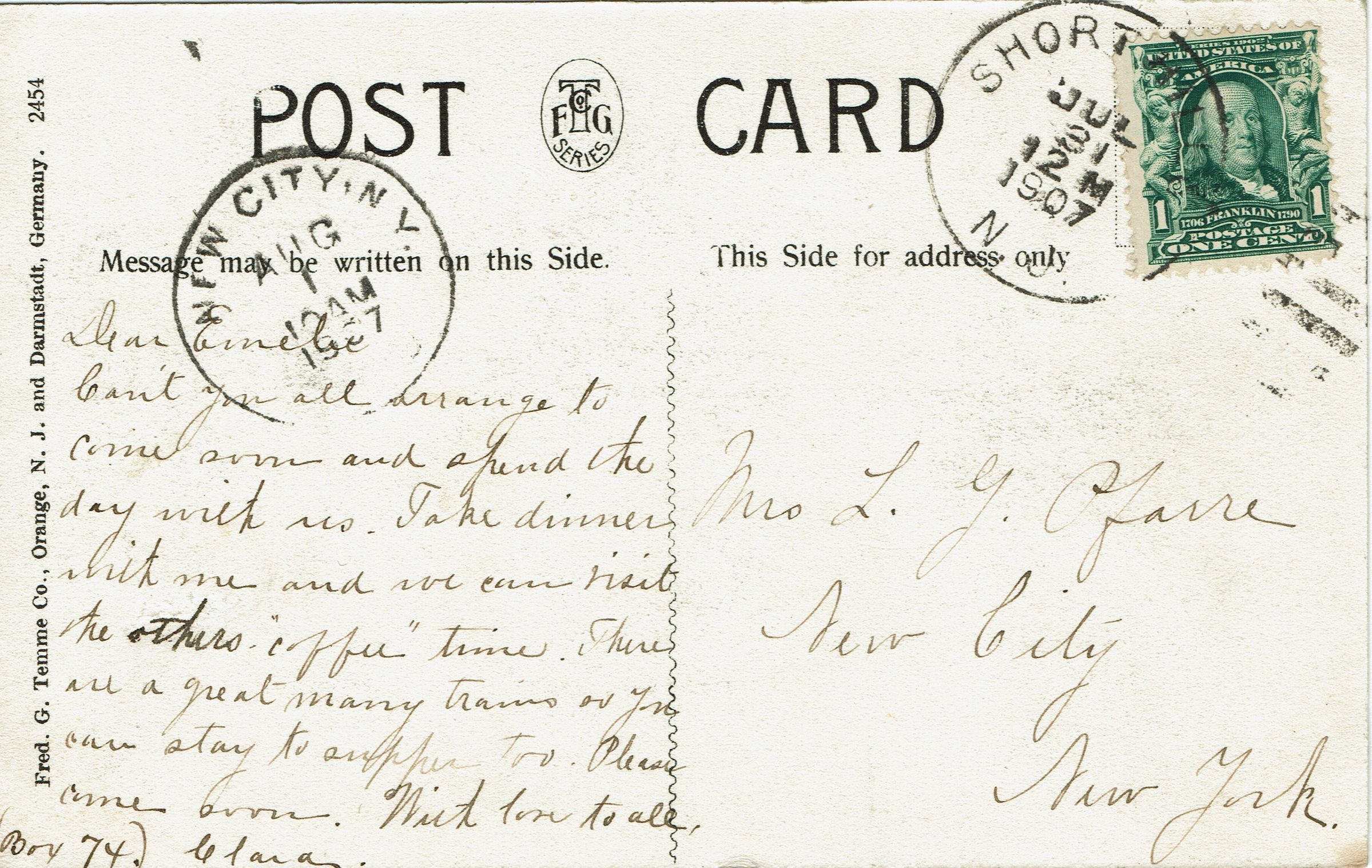 Postally used, photographic postcard of The Casino, Short Hills. Postmarked Short Hills, July 31, 1907, 12 M and received New City, NY, August 1, 1907, 10 am. Postcard is addressed to Mrs. L. Y. Pfarre, New City, New York.
