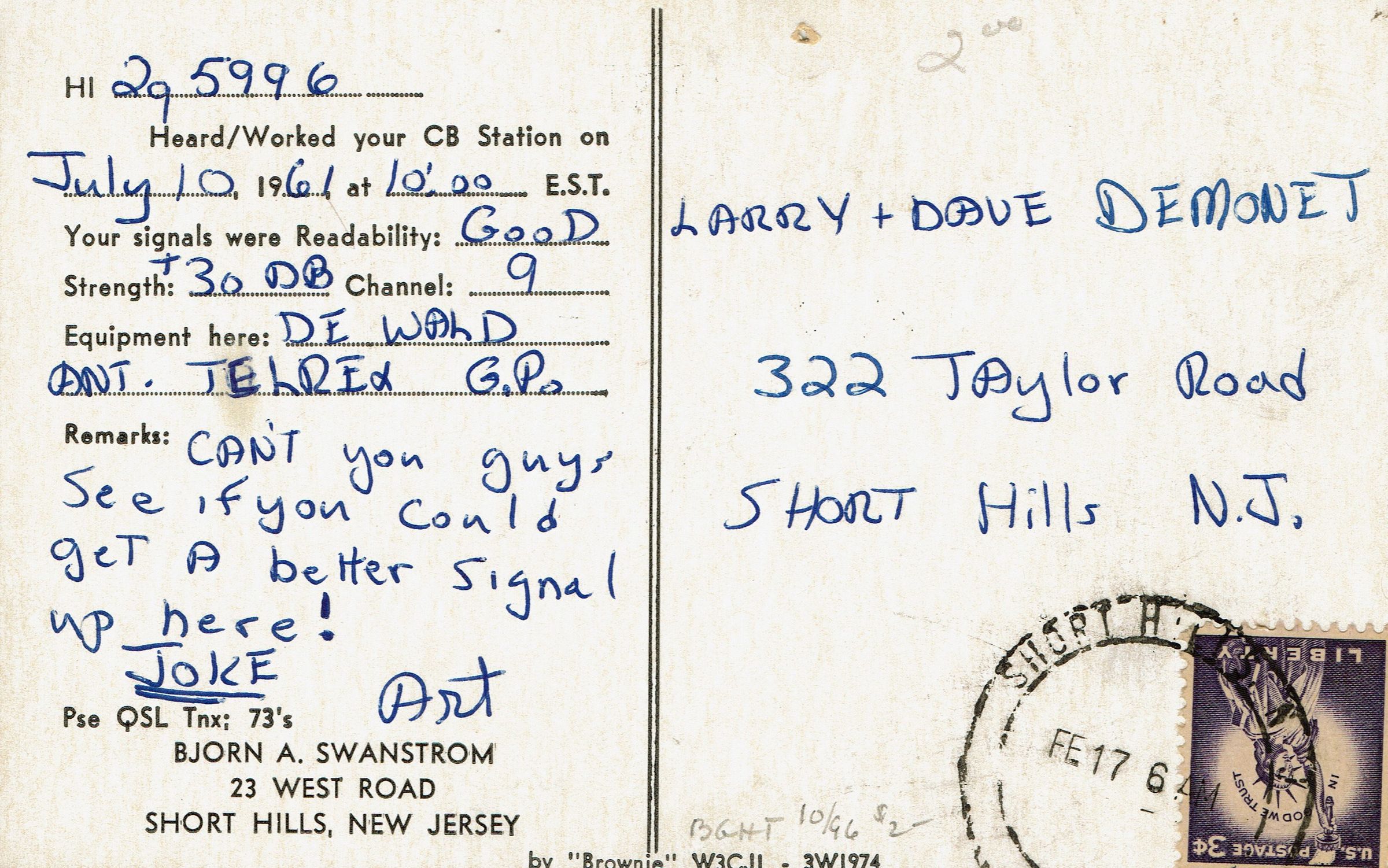 Ham Radio card for Bjorn A. Swanstrom, 23 West Road, Short Hills, N.J., 1961. Postmarked Short Hills, February 17 and addressed to Larry and Dave Demonet, 322 Taylor Road, Short Hills.Collection