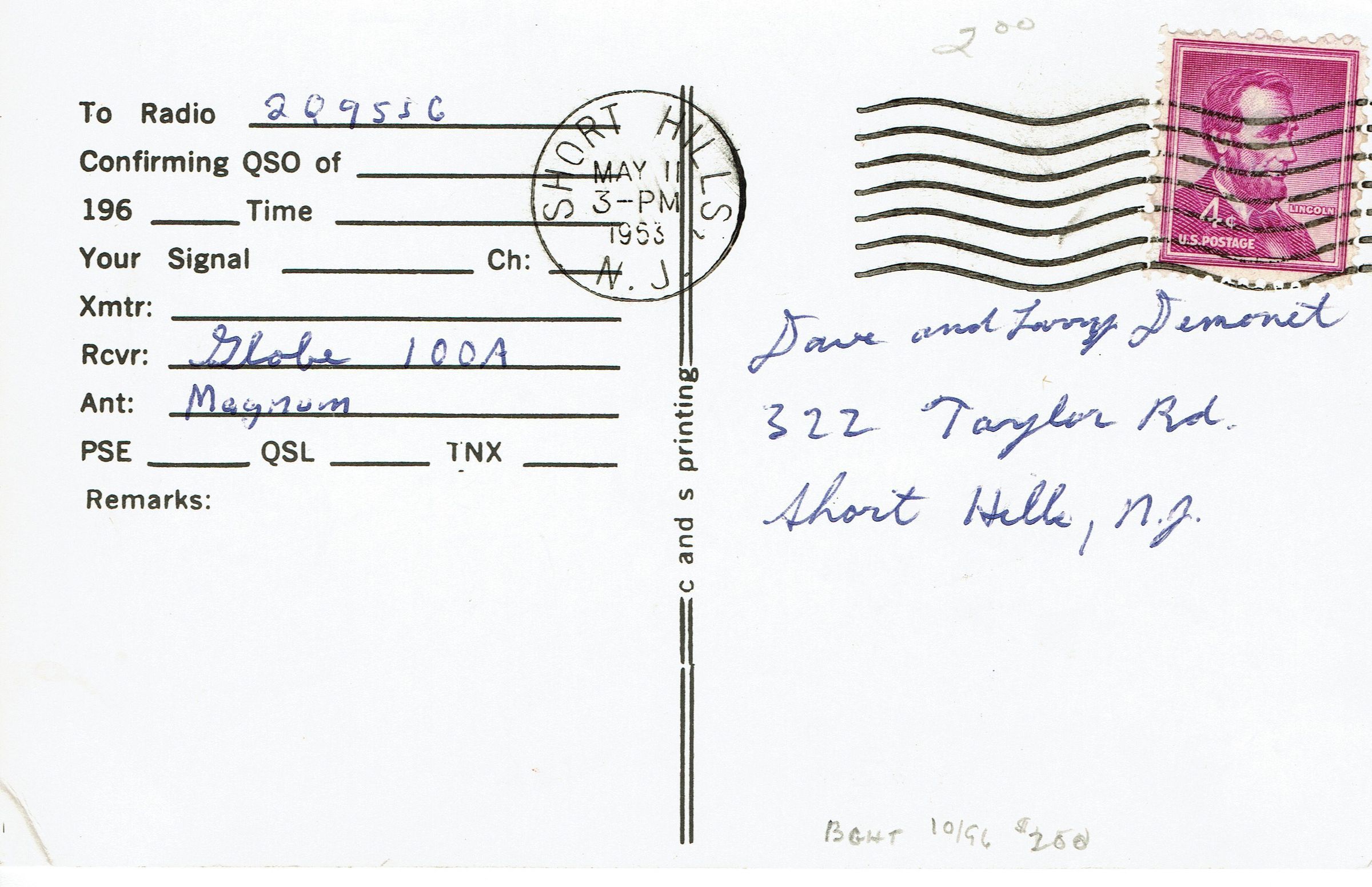 Ham Radio card for Bruce Corner, 25 Coleridge, Short Hills, N.J. 07078. Postmarked Short Hills, May 11, 1953, 3:00 pm. Addressed to Dave and Larry Demonet, 322 Taylor Road, Short Hills.Collection