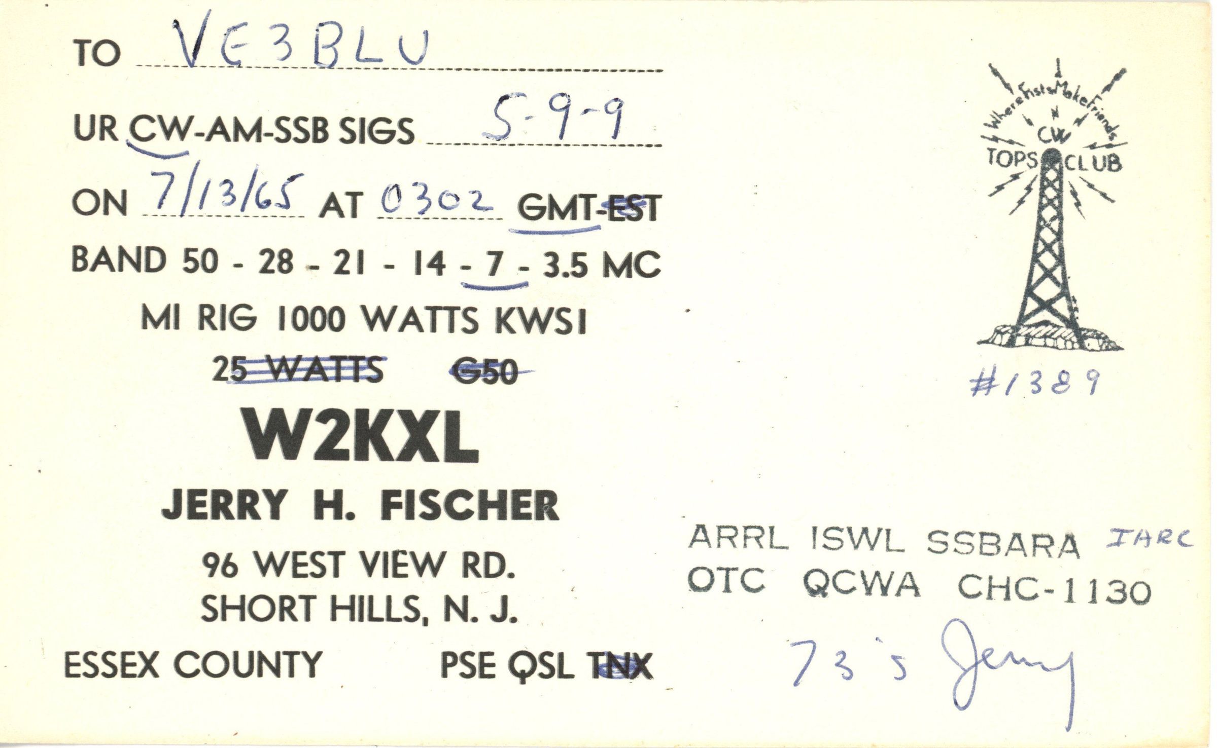 Ham radio postcard for Jerry H. Fischer, 96 West View Road, Short Hills, New Jersey to VEBLU on July 13, 1965.Acquisition