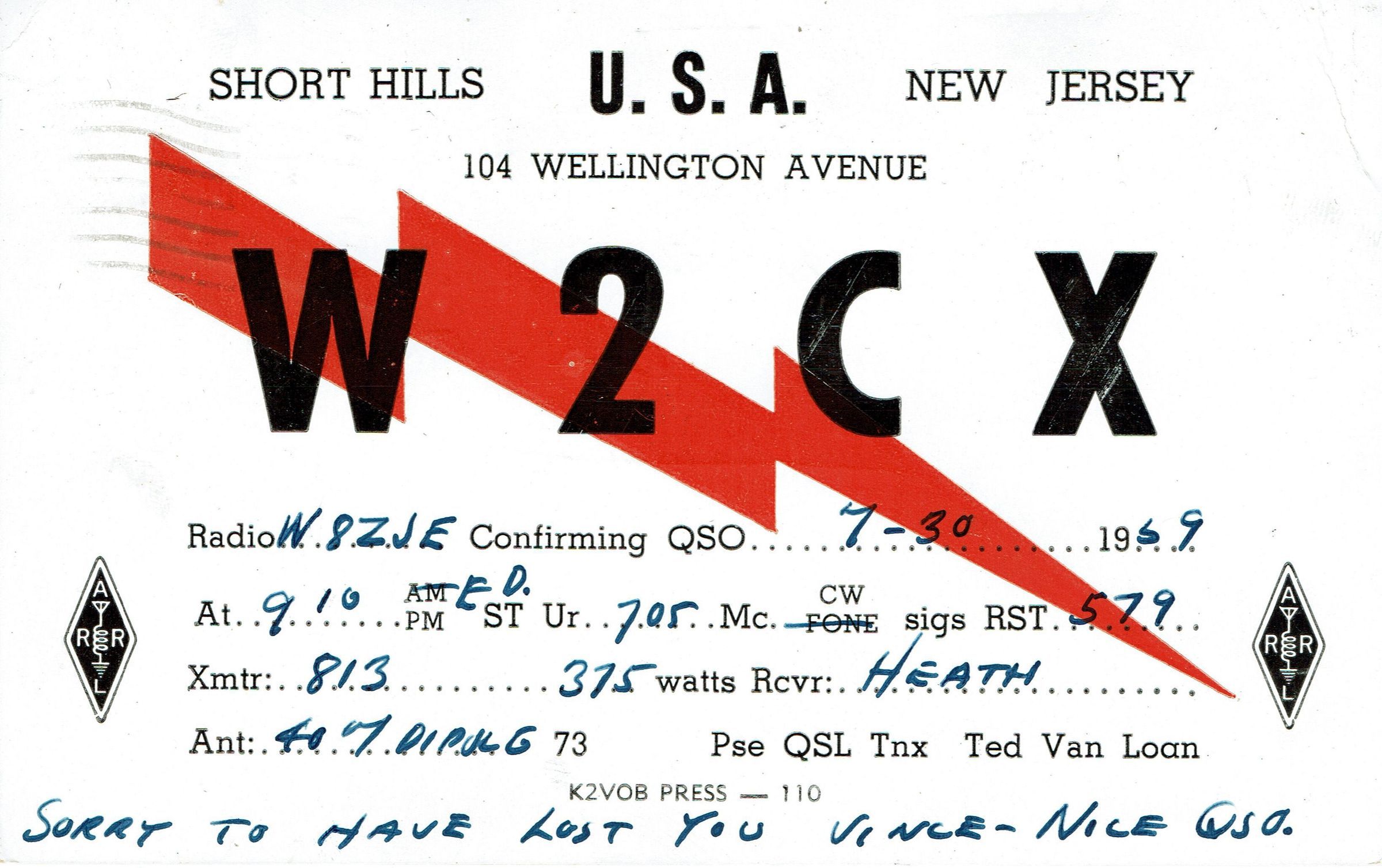 Radio: Ted Van Loan Ham Radio Card W2CX, 1959