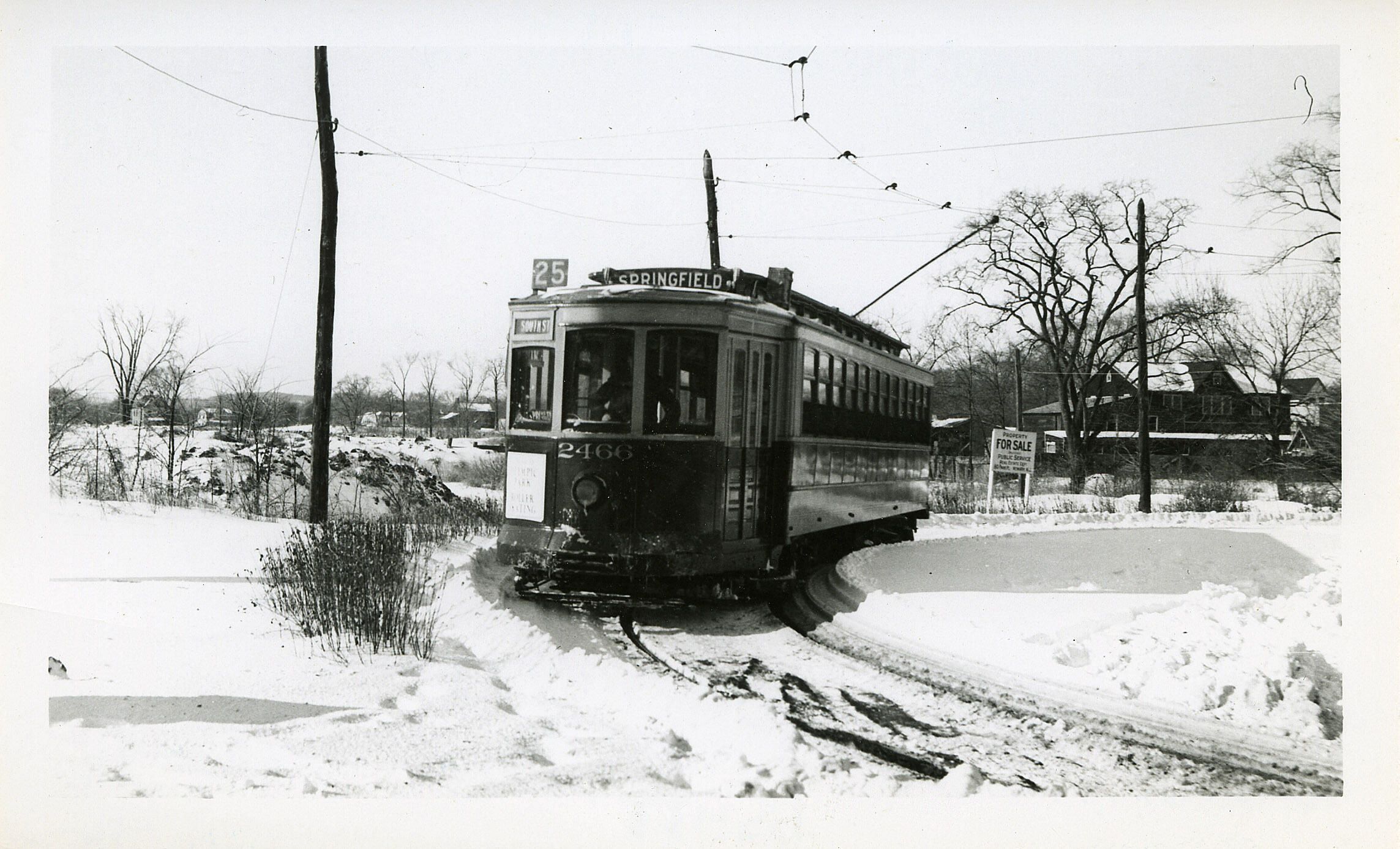 Car 2466 on Maplewood loop on Millburn Avenue near Cypress Street after a blizzard--red car.