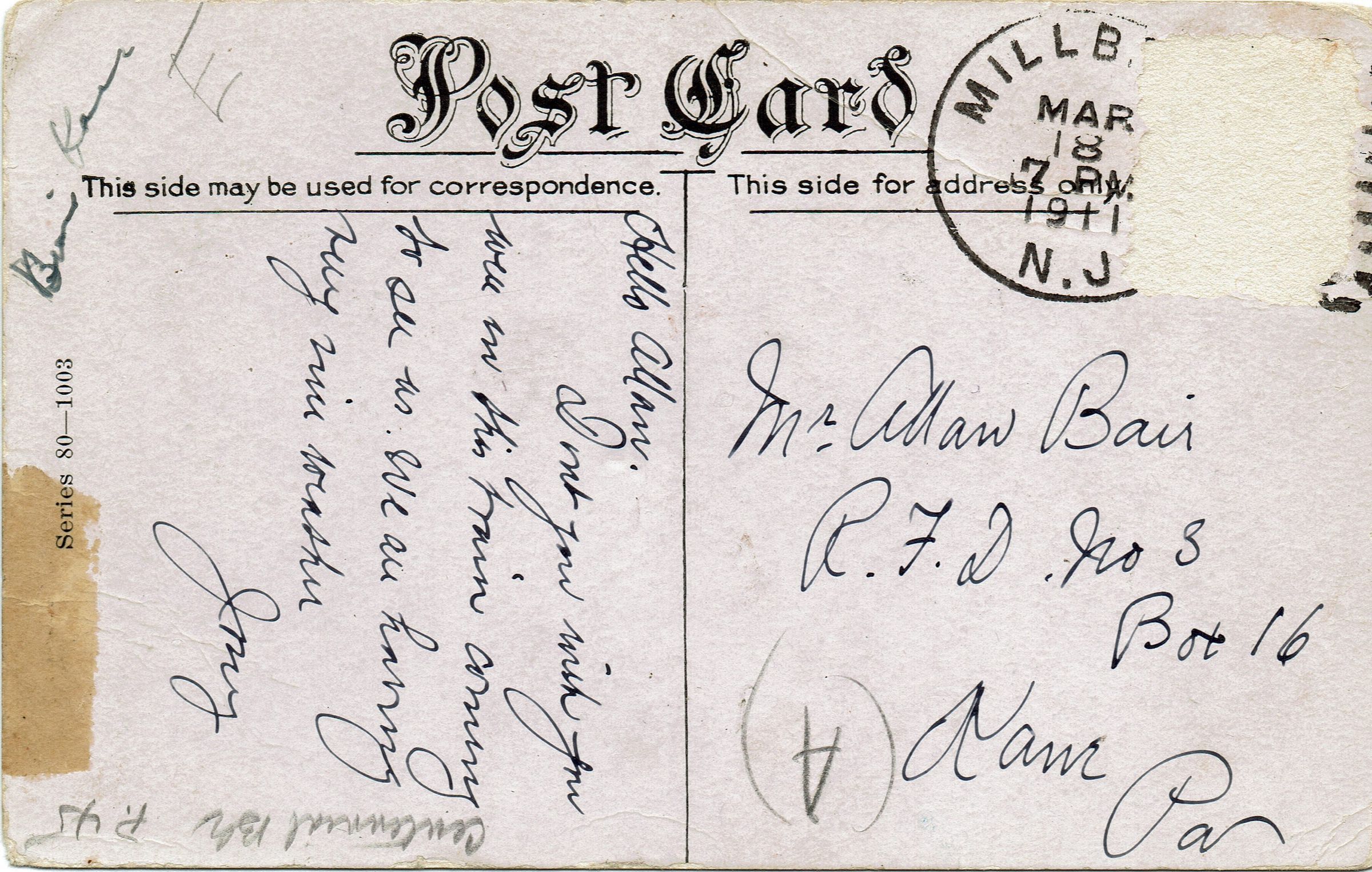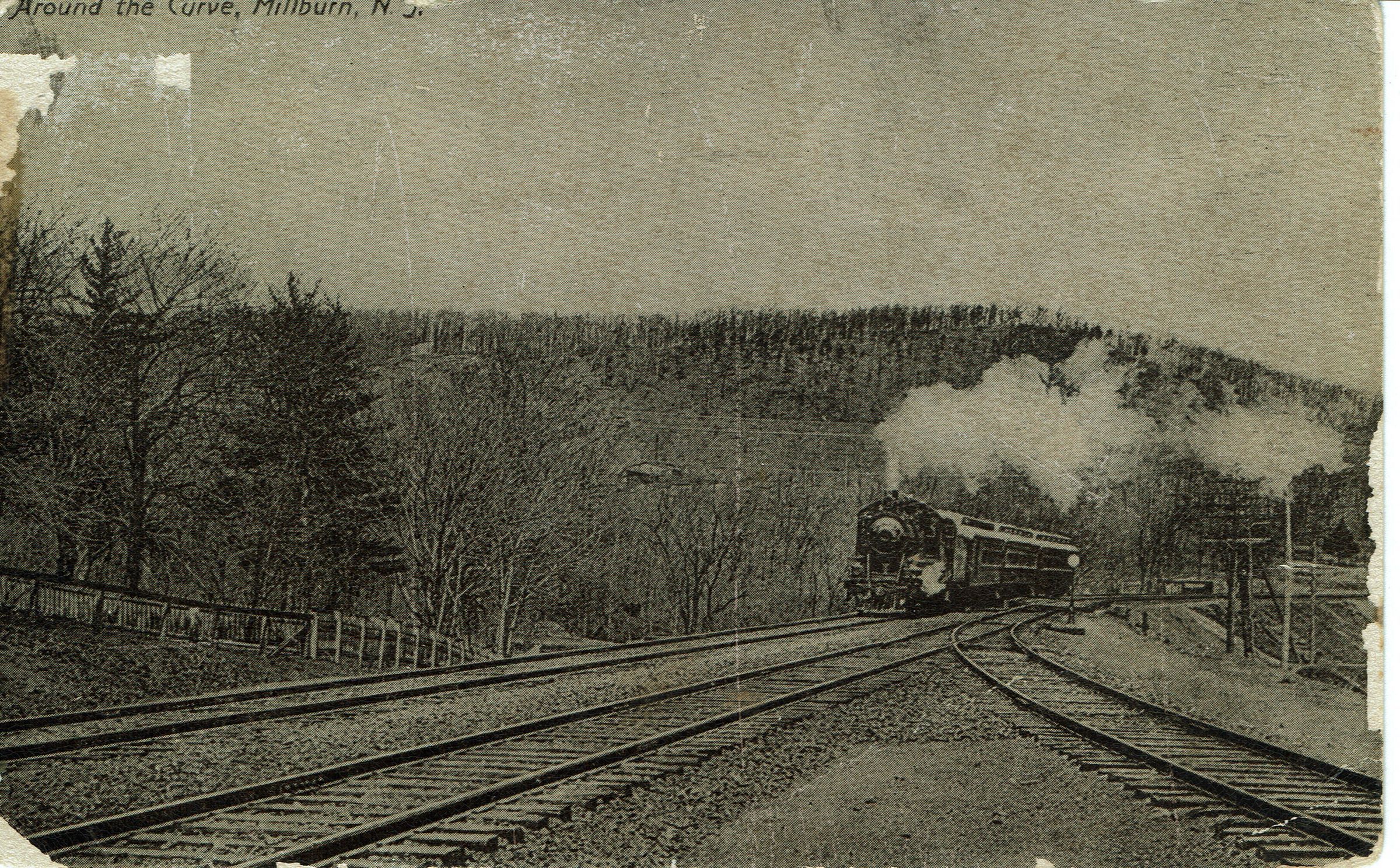Postally used postcard showing a westbound train rounding the curve in Millburn. with South Mountain in the background. The next stop is Short Hills. Postmarked Millburn, March 18, 1911, 7 pm and addressed to Mr. Allan Bair, R.F.D. no 3, Box 16Collection