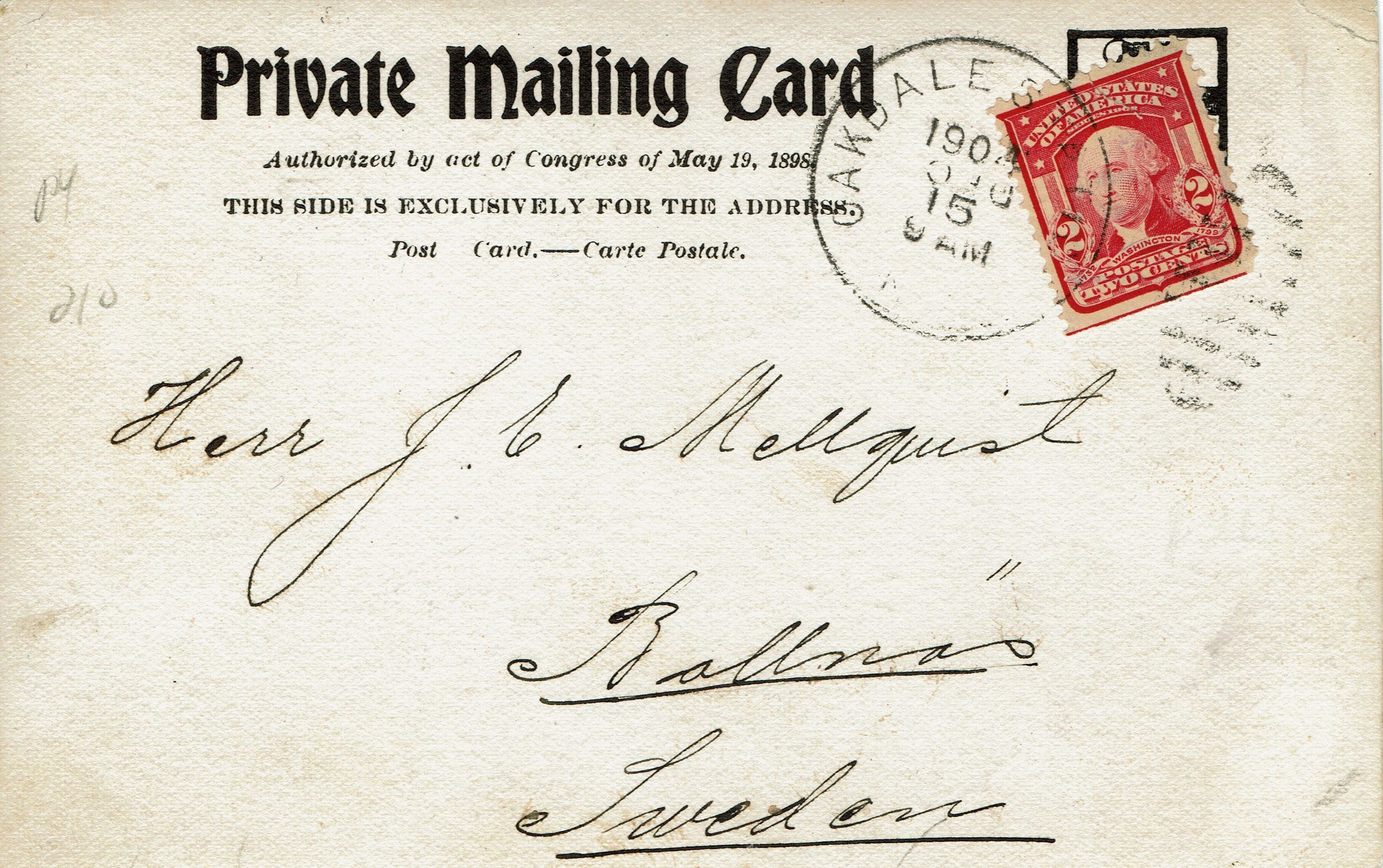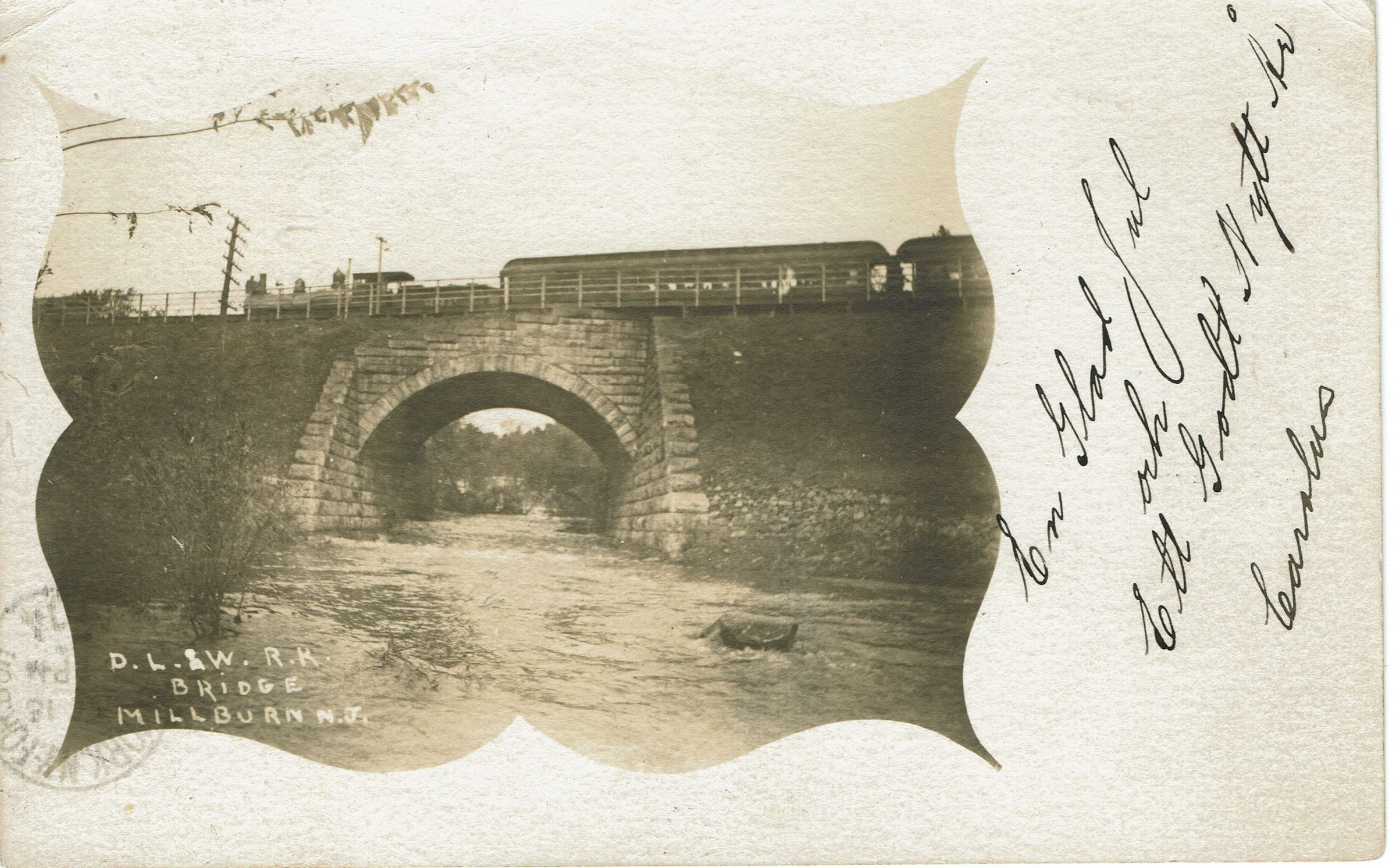 Photographic Postcard of the Delaware, Lackawanna and Wester Railroad Bridge, Millburn, NJ. Postmarked Oakdale 1904, 9 am and addressed to Herr J.C. Hellquist, Ballnas Sweden. Message in Swedish on front of postcard reads Merry Christmas and Happy New Year, Carolus.Collection