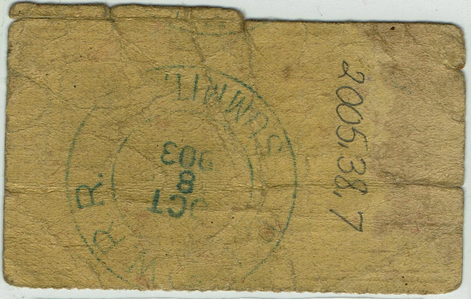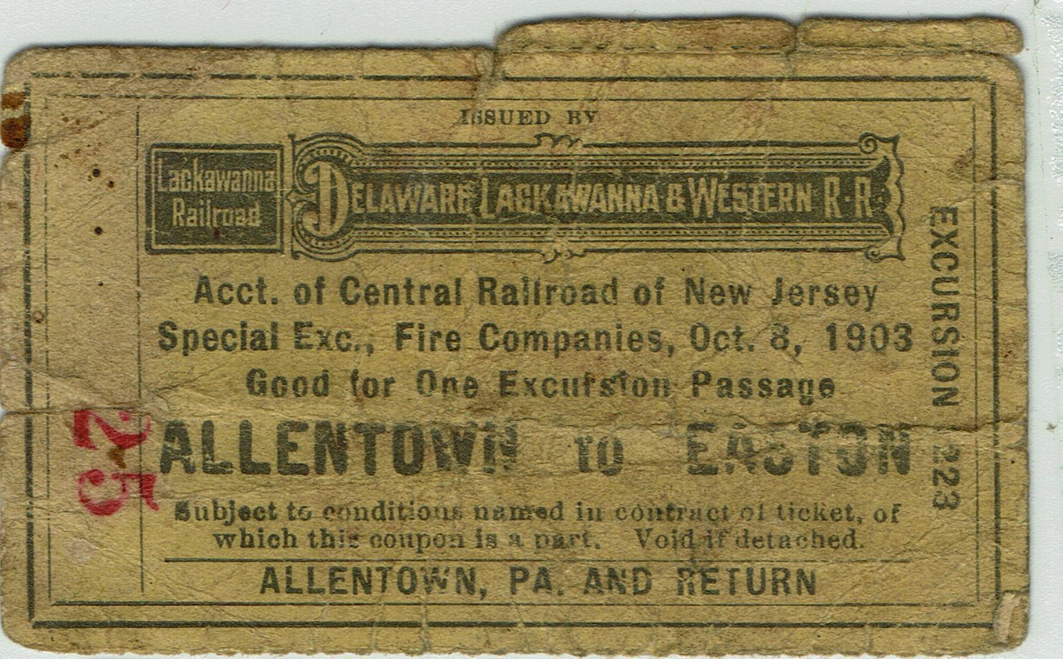 Roundtrip Railroad Ticket Allentown to Easton, Pennsylvania on the Delaware, Lackawanna & Western Railroad, excursion 1223 stamped Summit (N.J.), October 8, 1903.Collection