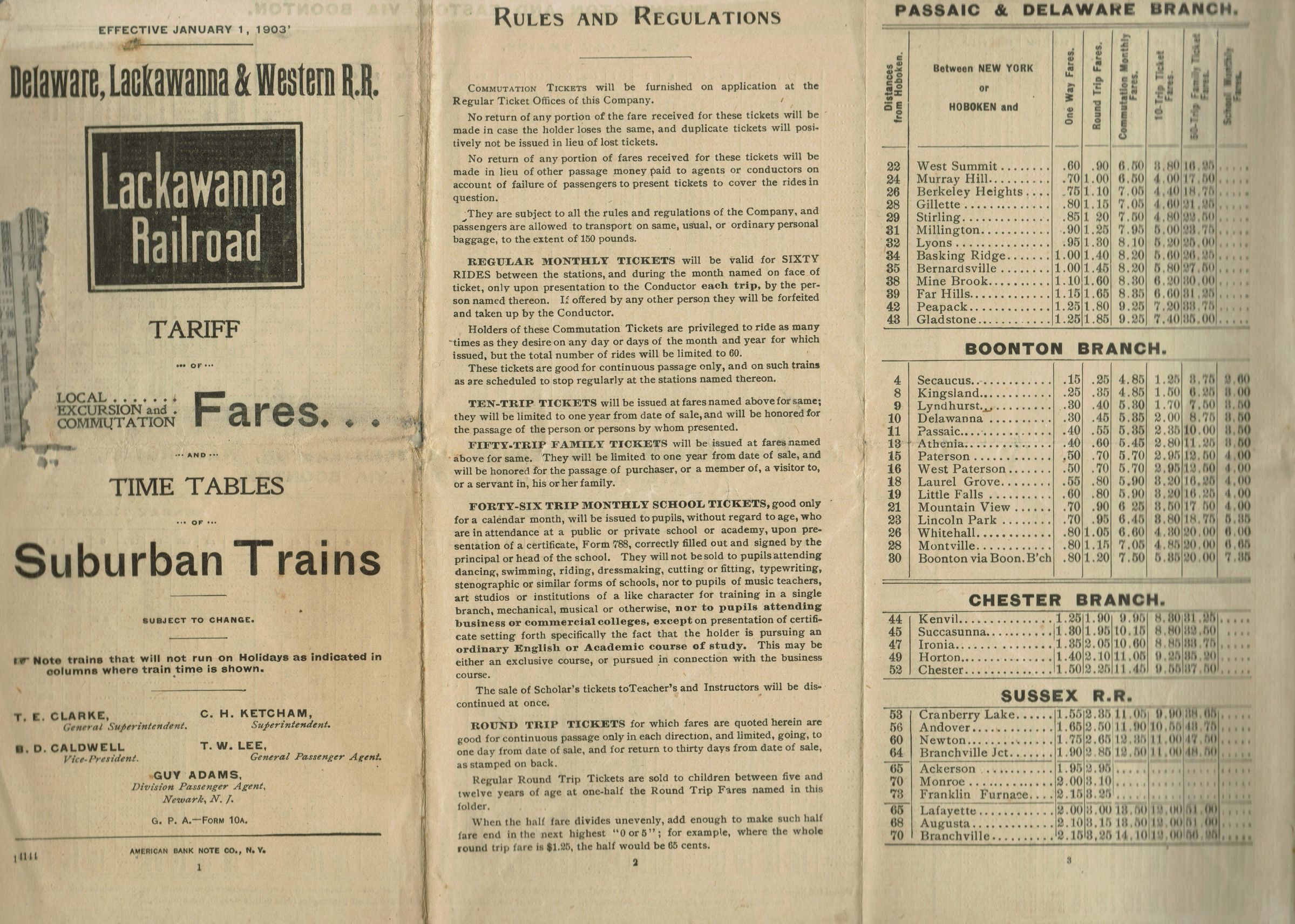 Lackawanna Railroad: Delaware, Lackawanna & Western Railroad Tariff of Local, Excursion and Commutation Fares and Time Tables of Suburban Trains. Effective January 1, 1903. 16 pp. folded brochure. Includes fares and time tables for the Morris and Essex Division between New York and Hoboken to Wyoming, Millburn, Short Hills and west to Easton Pennsylvania.Collection