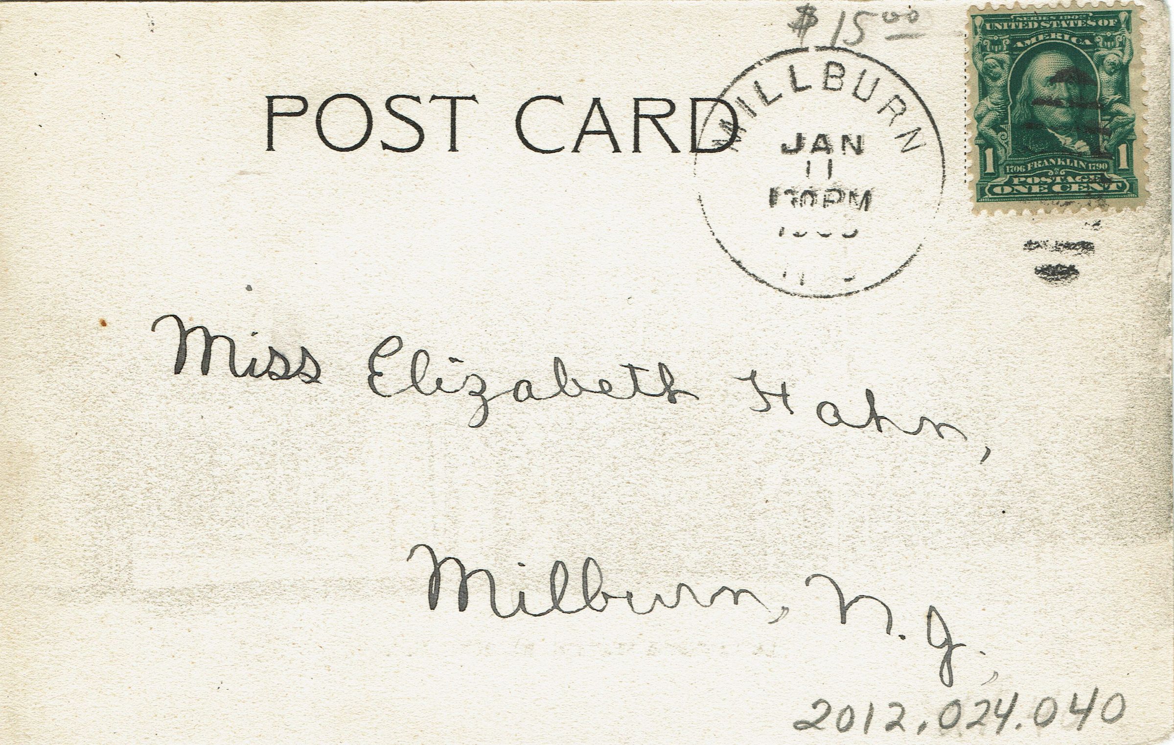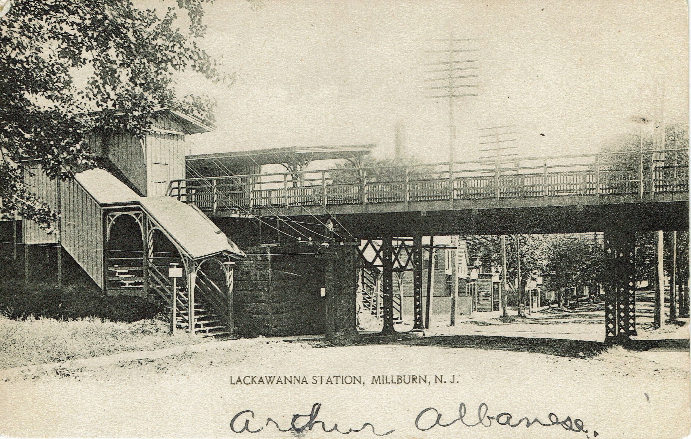 Postally used B&W postcard of the Lackawanna Railroad Station on Old Short Hills Road. Postmark unclear, addressed to Miss Elizabeth Hahn, Millburn, NJ. Name on front of the postcard, Arthur Albanese.Collection