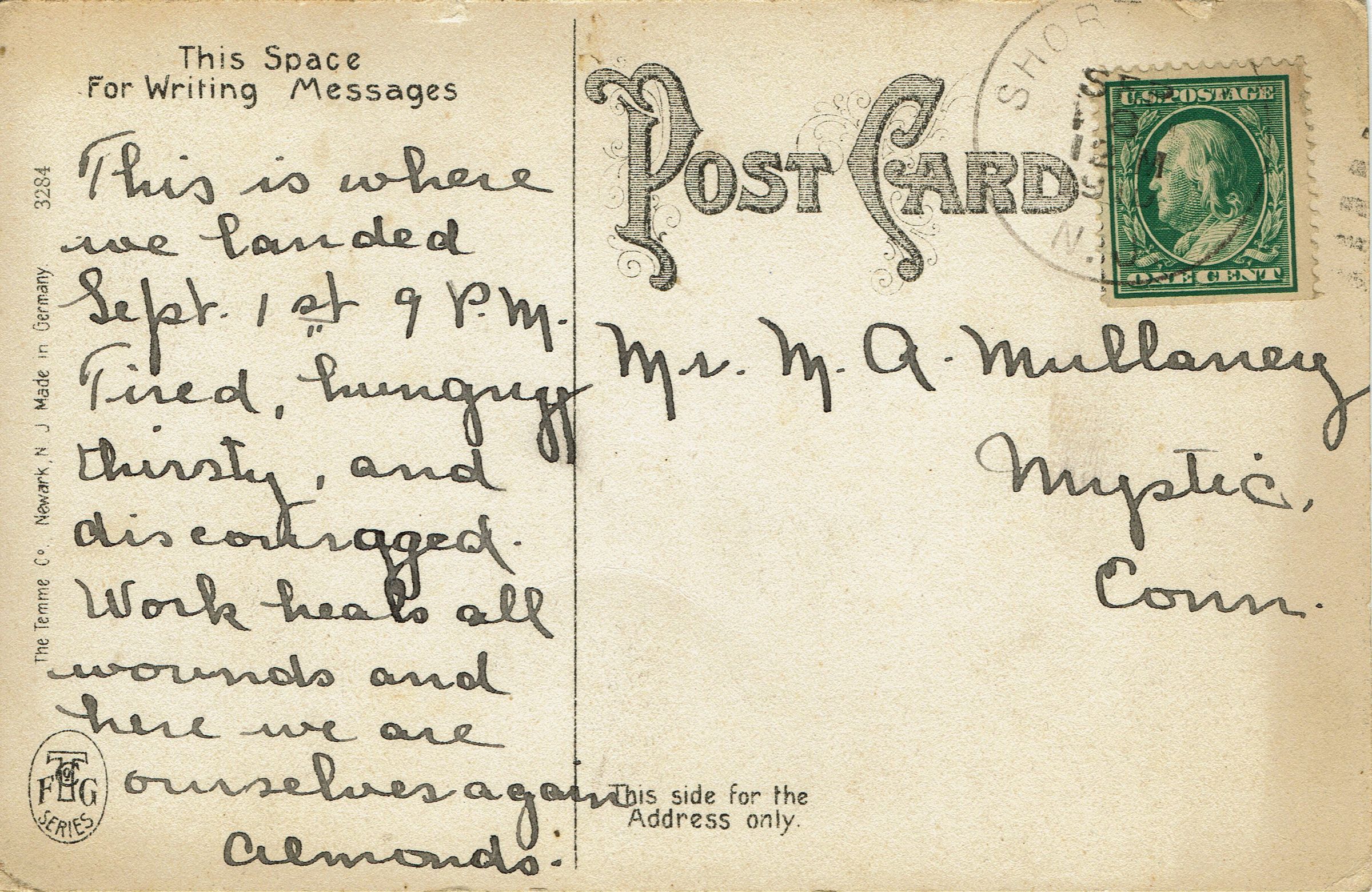 Postally used, B&W photographic postcard of the second Lackawanna Railroad Station, Short Hills. Postmarked Short Hills, September 18, 1910, 12 M. Sent to Mr. M.A. Mullaney, Mystic Connecticut. Message reads: "This is where we landed Sept 1st 9 PM. Tired, hungry, thirsty and discouraged. Work heals all wounds and here we are ourselves again. Almonds."