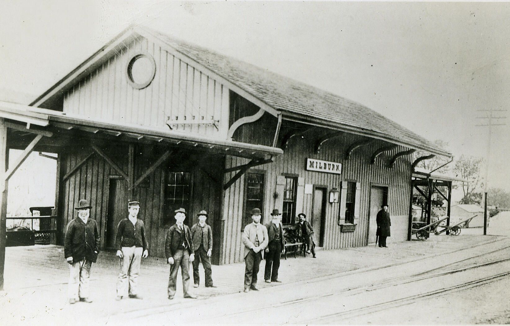 The photograph first appeared in the April 29, 1948 edition of The Item and was reprinted in the 1957 Centennial Book, "Milburn railroad station in 1892 when the tracks ran at grade level and one L in Millburn was the vogue. Just when the additional L was added is unknown, but it presumable came along with the change in location of the station to its present position. Pictured are: Michael Flanagan (gateman), George McCollum (baggage master), B.L. Farrell (ticket agent), Irving McCollum, John McCollum (station agent), David Townley, Albert Sickley and Rev. A.W.Stanley. Horsedrawn buggies were in style as shown in the rear left hand corner."