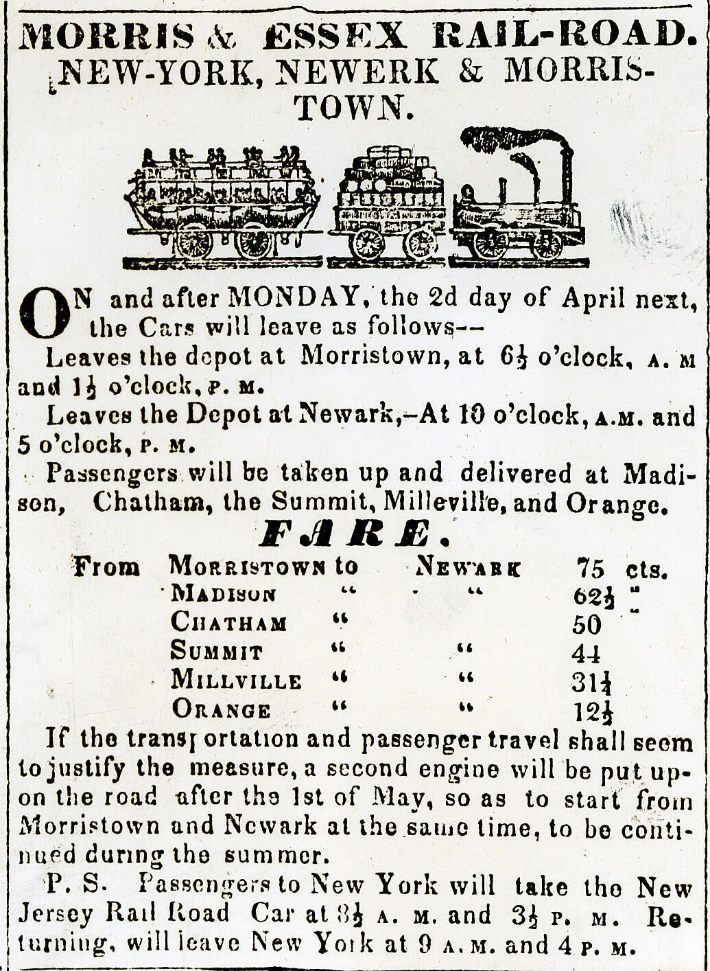 Photograph of the Morris & Essex railroad time table from the Morristown Jerseyman, March 20, 1838. Time table and statement of fare was probably published withn the line west of Summit was opened.Collection