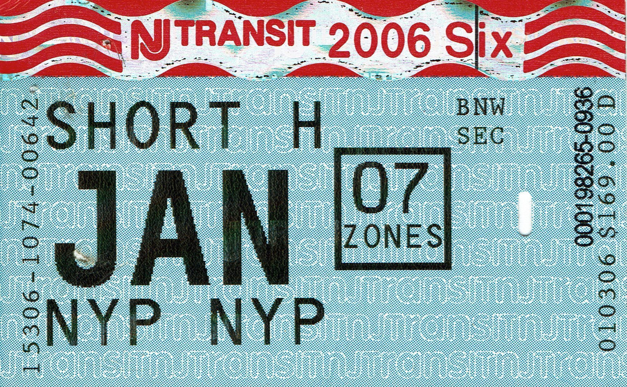 New Jersey Transit monthly rail pass between Short Hills, New Jersey and New York, Pennsylvania Station for January 2006.Acquisition